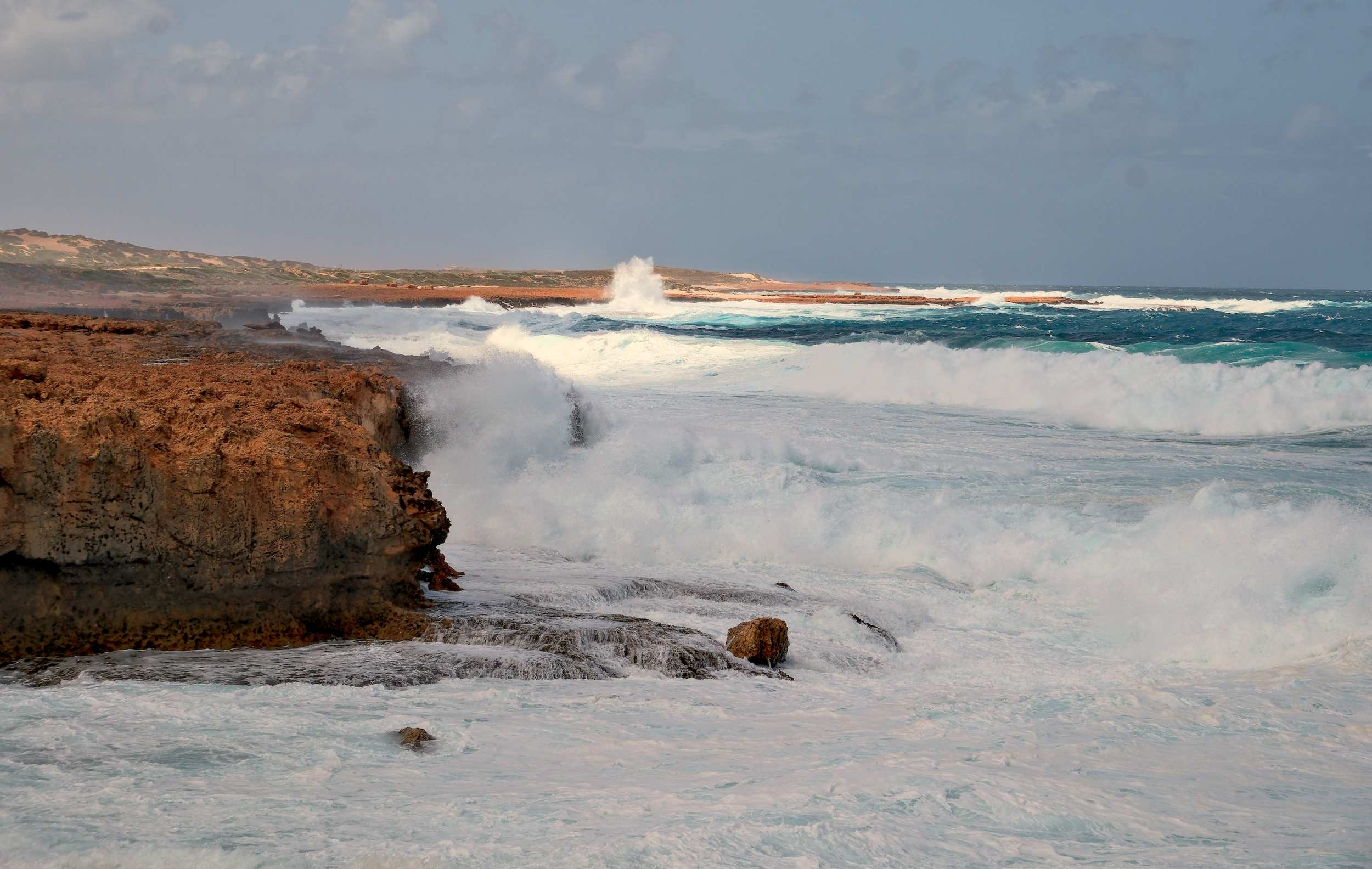 Seit Tagen weht viel Wind von See, dementsprechend hohe Wellen donnern auf die Felsküste und erzeugen riesige Gischtwolken.
