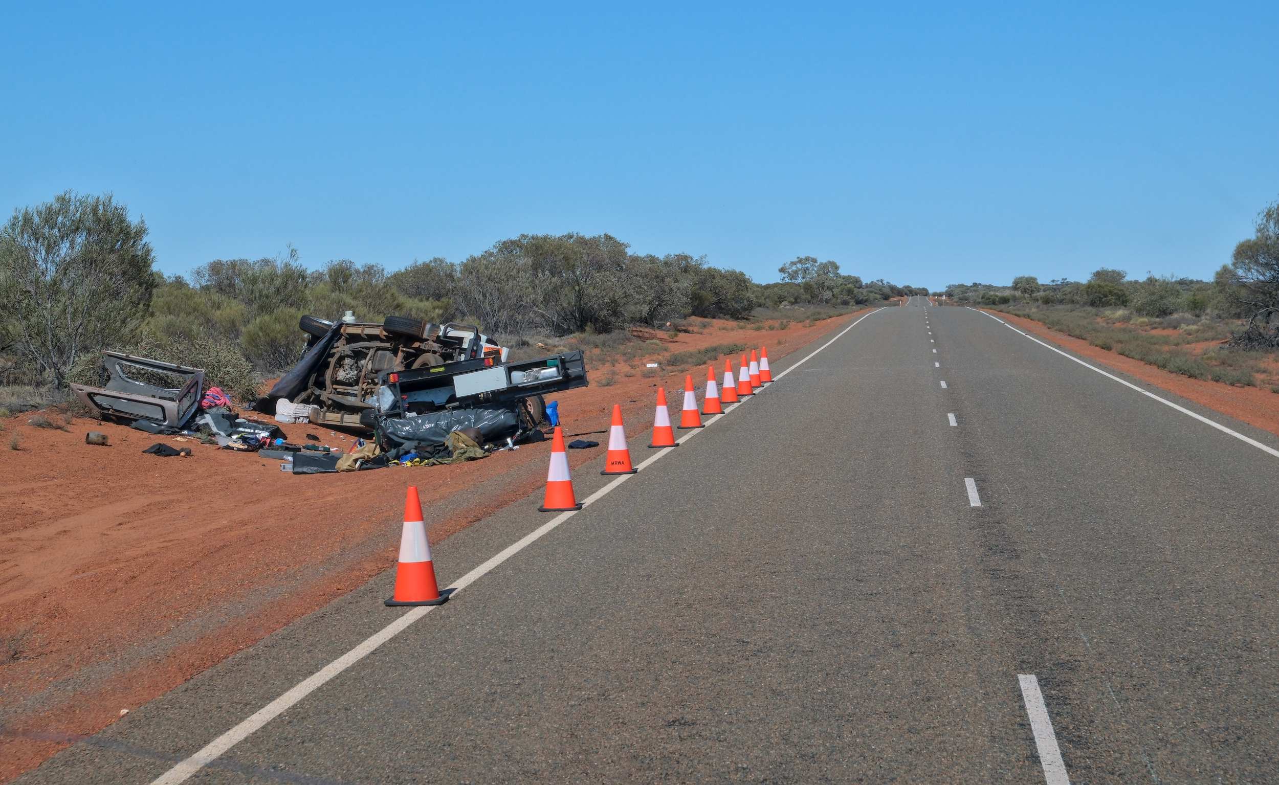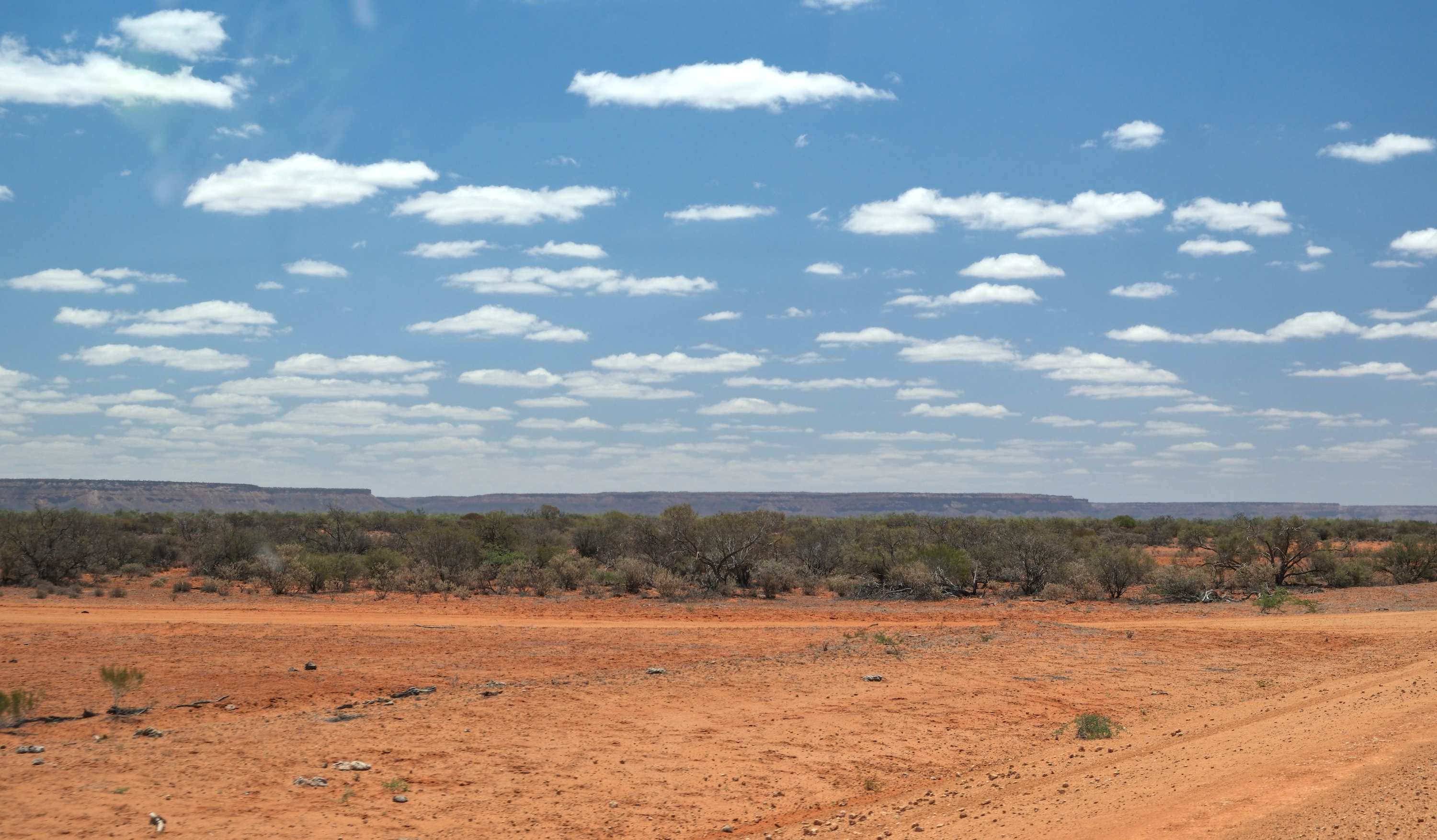 Am nächsten Morgen um 6 Uhr aufgebrochen, weil wieder gut 300 km Gravelroad plus 40 Asphalt vor uns lagen. Nach 19 km einen platten Reifen gewechselt und nach 255 km dem ersten Fahrzeug begegnet. Gut auf den asphaltierten 'Great Northern Highway' gekommen. Aufatmen: Einen weiteren Reifendefekt hätten wir nicht selbst beheben können, wir hatten nur noch einen Ersatzreifen, der nicht auf ein Rad montiert war. Ein Hilferuf wäre sehr teuer geworden.