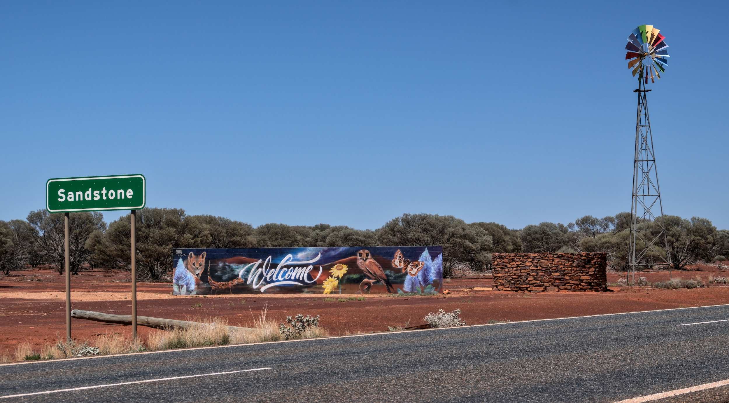 Einfahrt nach Sandstone (2021: 168 Einwohner) mit dem regenbogenfarbigen Windrad, das auch im Wappen des Ortes auftaucht.