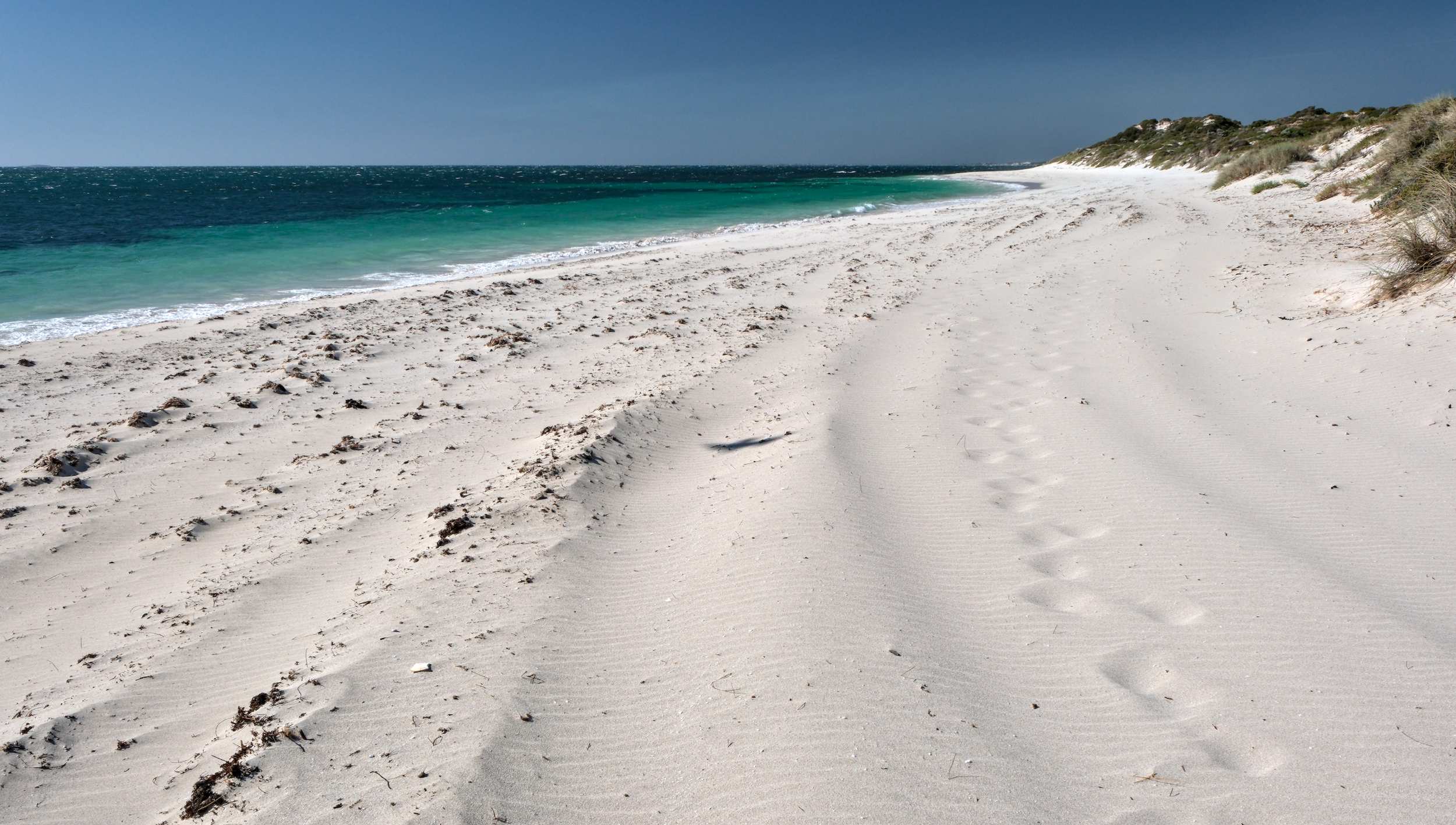 Faszinierende Kalksteinfelsen vor strahlend weißen Dünen.