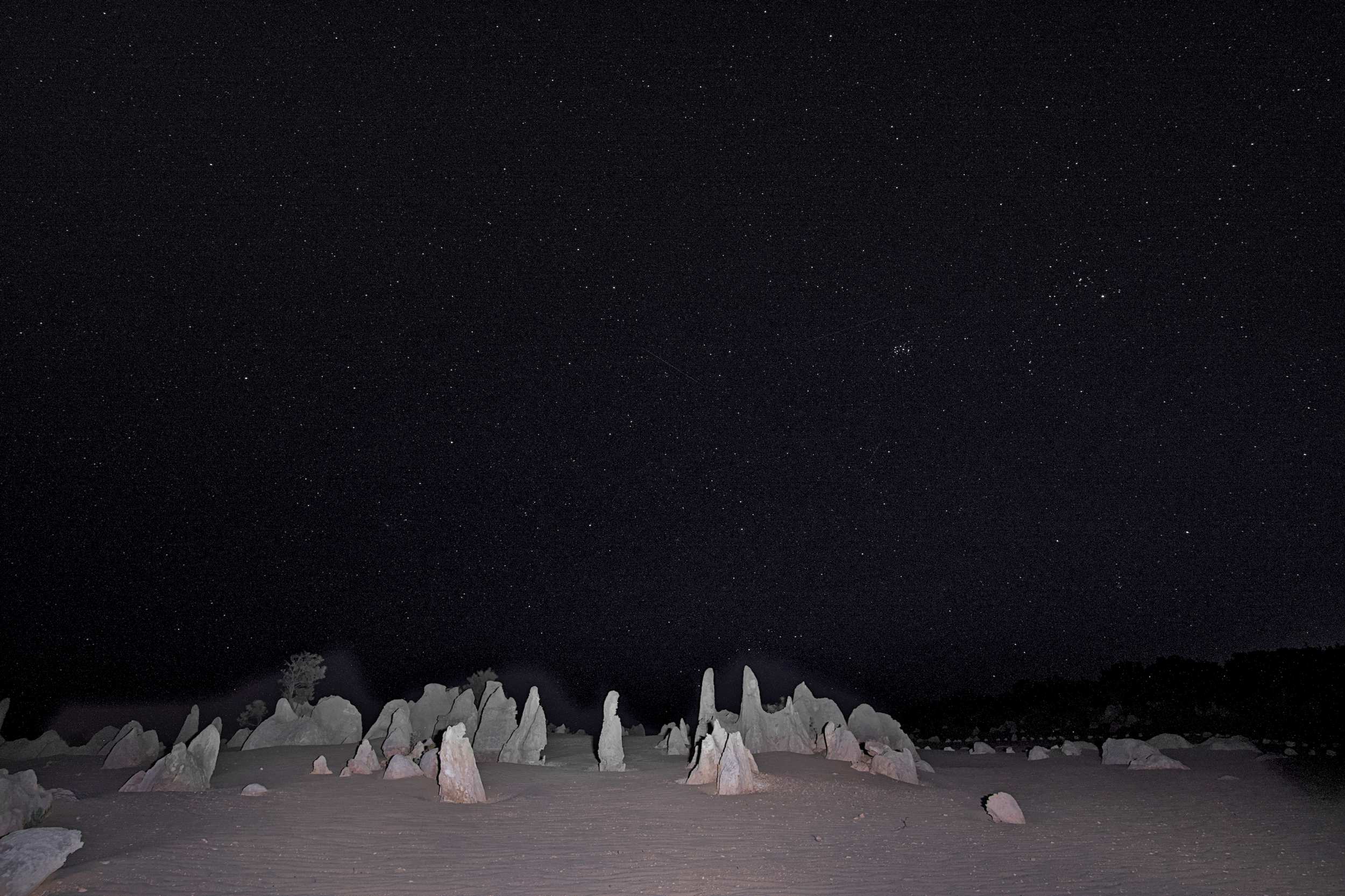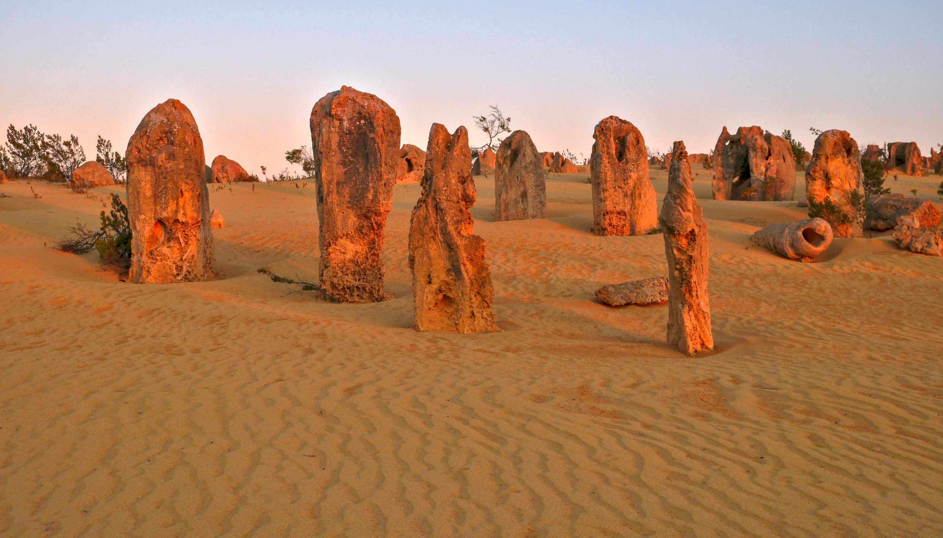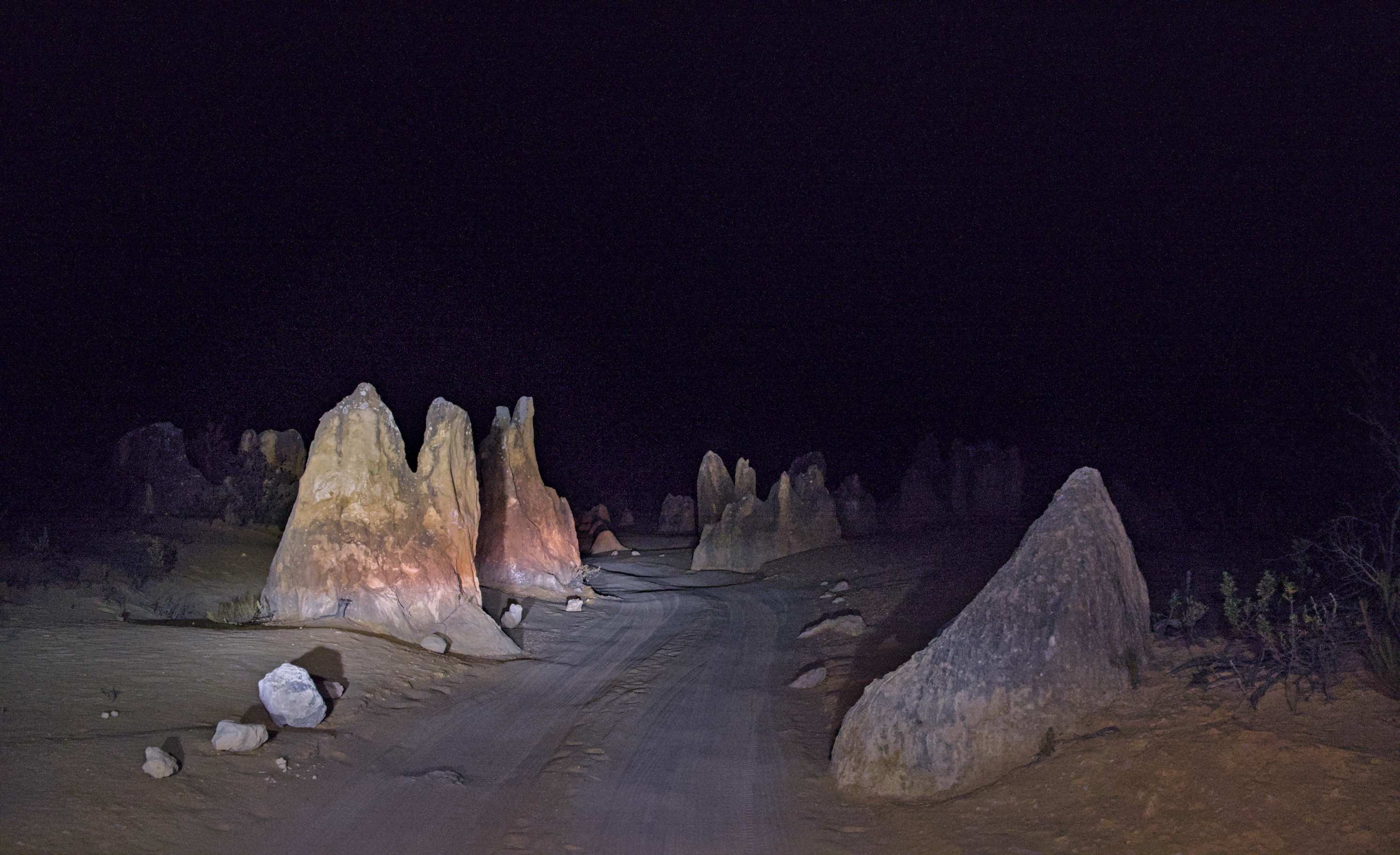 Am folgenden Tag, mit einer langen, wieder küstennahen Etappe, wo man überall auch viel Zeit verbringen könnte, den 'Nambung National Park' angesteuert. Dort haben wir uns die tausenden Kalksteinsäulen (Pinnacles), die dort einfach so "herumstehen", angesehen. Wir waren so begeistert, dass wir in der Abenddämmerung dreimal auf dem Rundkurs herumfuhren, noch bis spät in die Nacht dort blieben und die Sterne bewundert haben.
