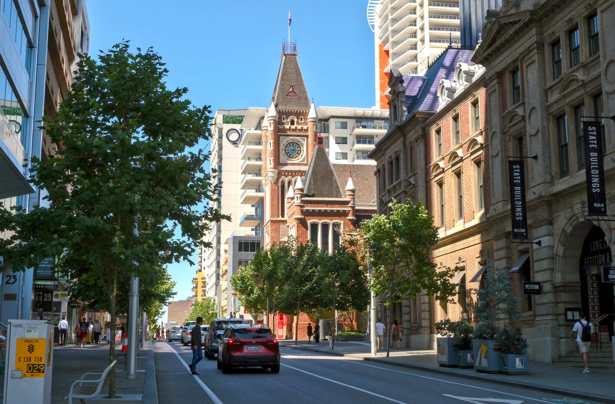 Die Innenstadt (CBD) von Perth, viel Grün, alte und neue Bauten, sauber und ansprechend.