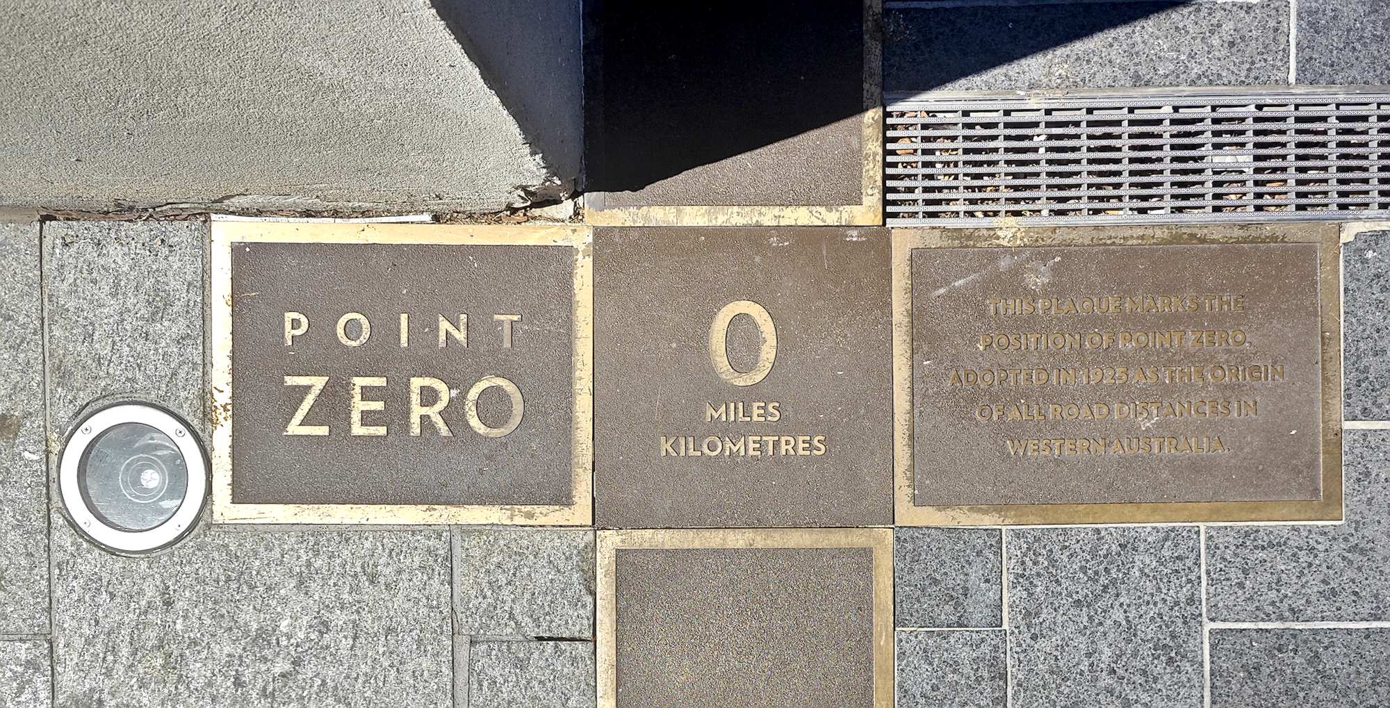 "Diese Tafel markiert die Position von Punkt Null, der 1925 als Ursprung aller Straßenentfernungen in Westaustralien eingeführt wurde".