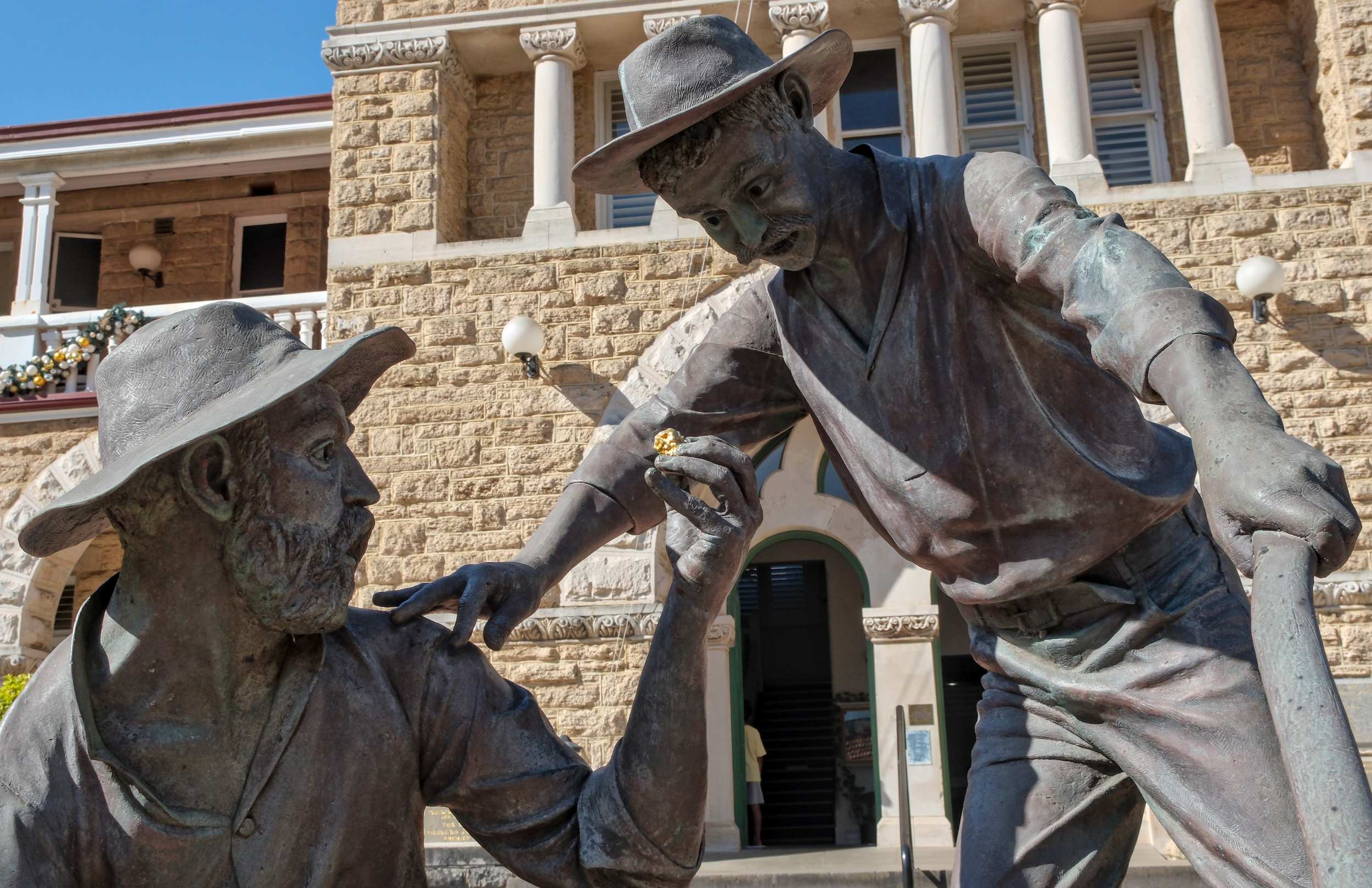 Zwei Goldsucher vor der Mint (Münzprägeanstalt) in Perth, sichtlich verblüfft über ihren außerordentlichen Fund.