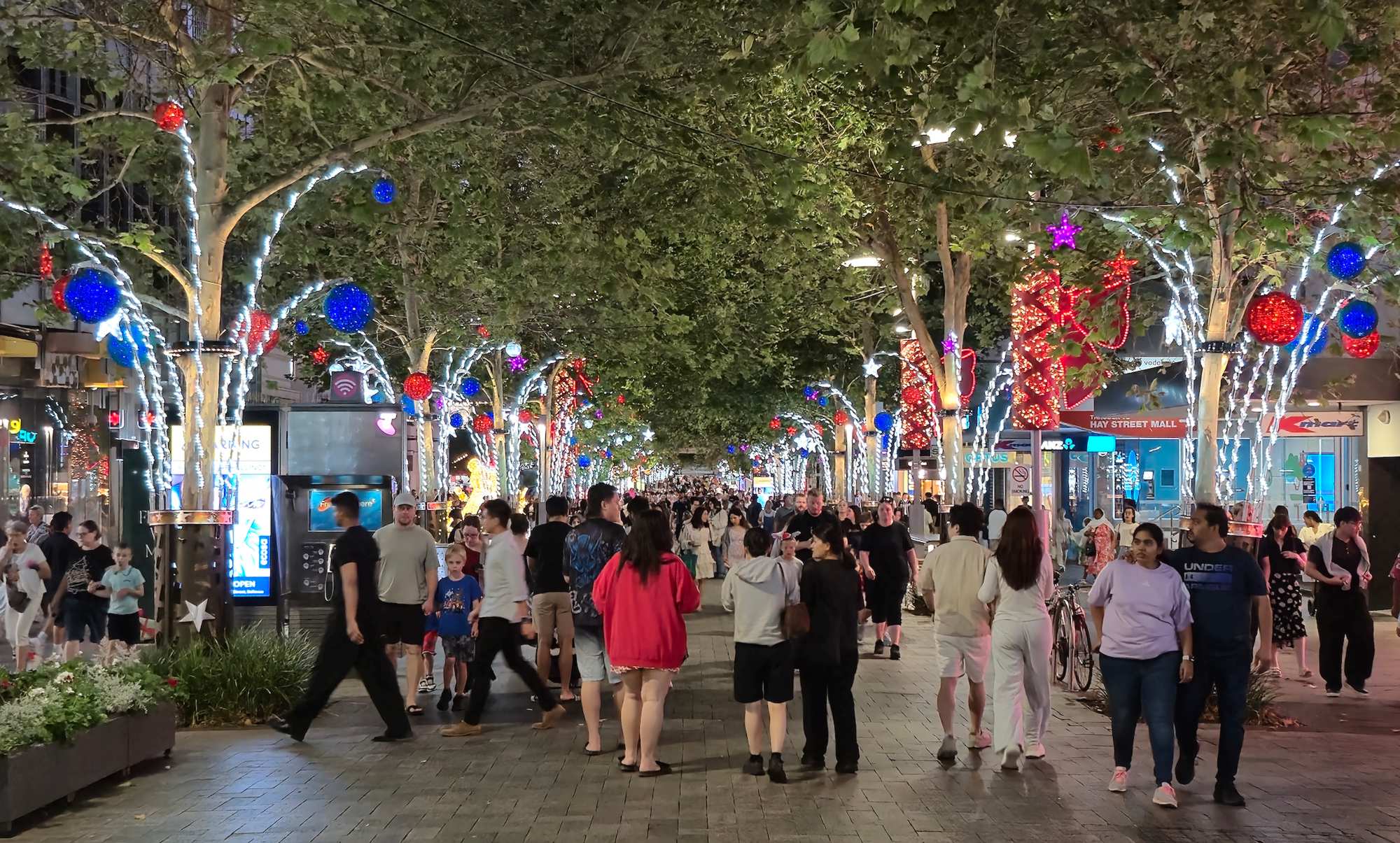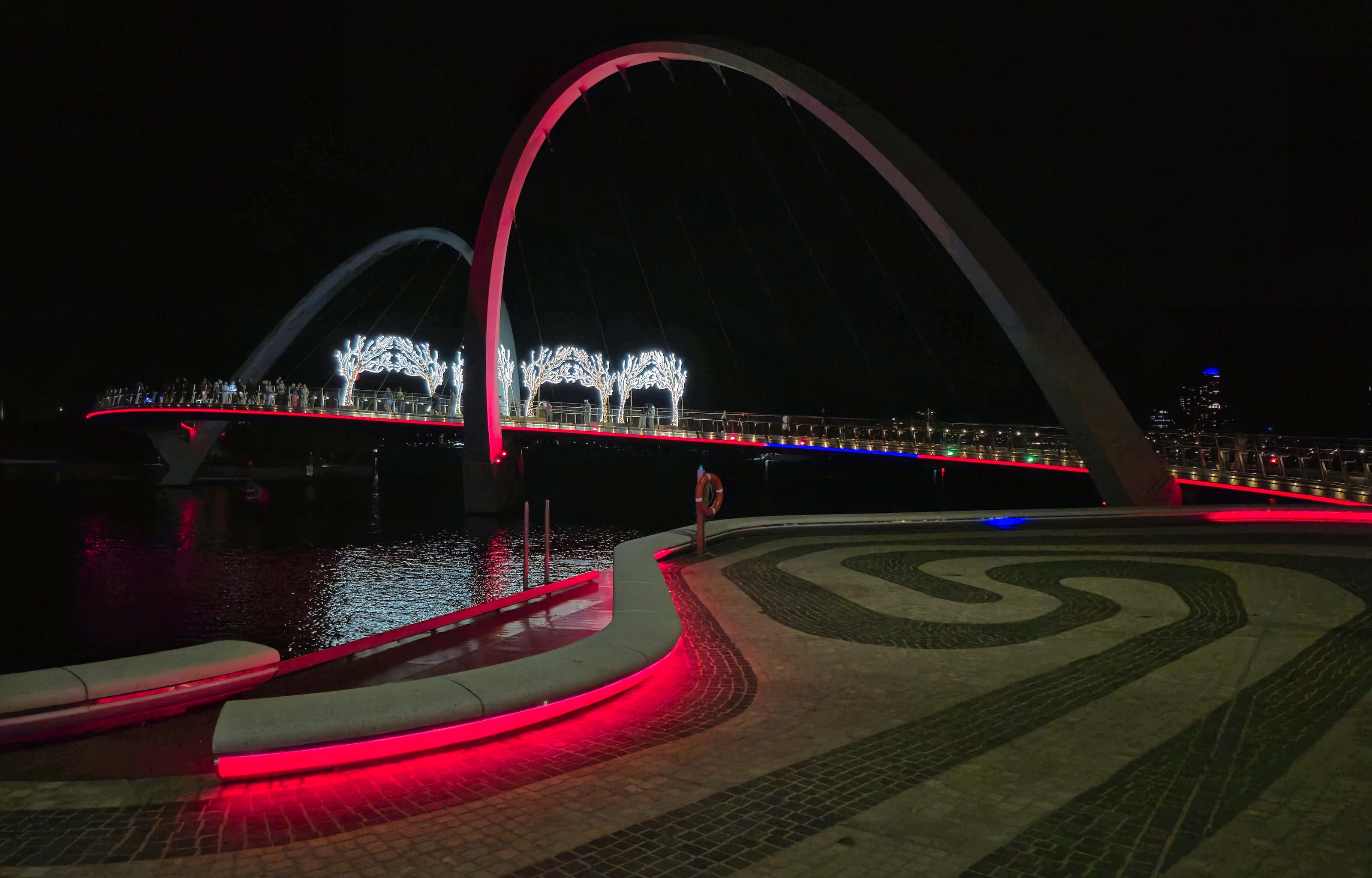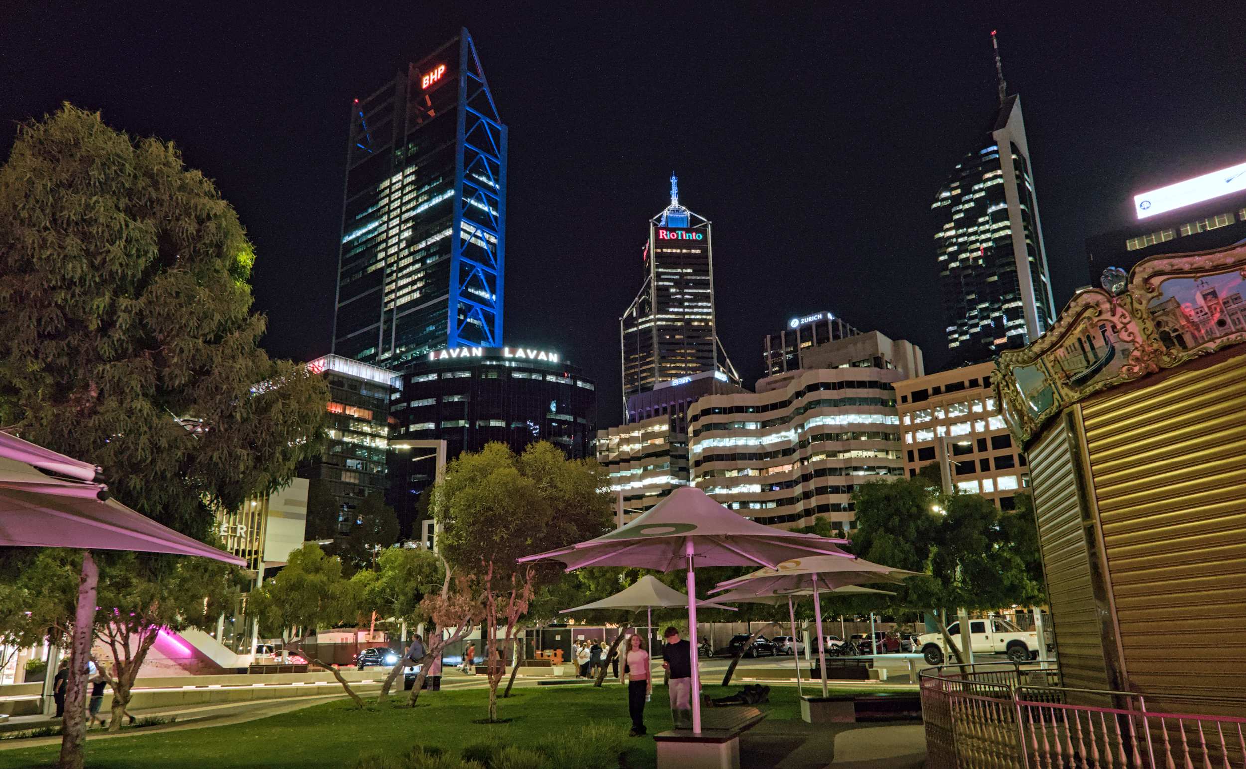 Statt am Mittwochvormittag, konnten wir erst um 17 Uhr mit Bertha von Mercedes aus in den Heiligabend starten, wobei die Windschutzscheibe auf der Straße vor dem inzwischen geschlossenen Werkstattgeländetor, von einer mobilen Autoglaserei gegen 15 Uhr, eingebaut wurde, aber der Kleber noch etwa zwei Stunden trocknen musste. Wir waren dann noch kurz einkaufen und haben bei einem sehr netten Afghanen einen guten Döner, bzw. Falafel, zum Abendmahl verspeist. Übernachtet haben wir am 'Point Belches' auf einem Parkplatz an einer ruhigen Anwohnerstraße mit herrlichem direkten Blick über den Swan River, hier verbreitert zu einem See ('Perth Water'), auf den 'Elisabeth Quai' und die Skyline vom Central Busines District (CBD) von Perth.