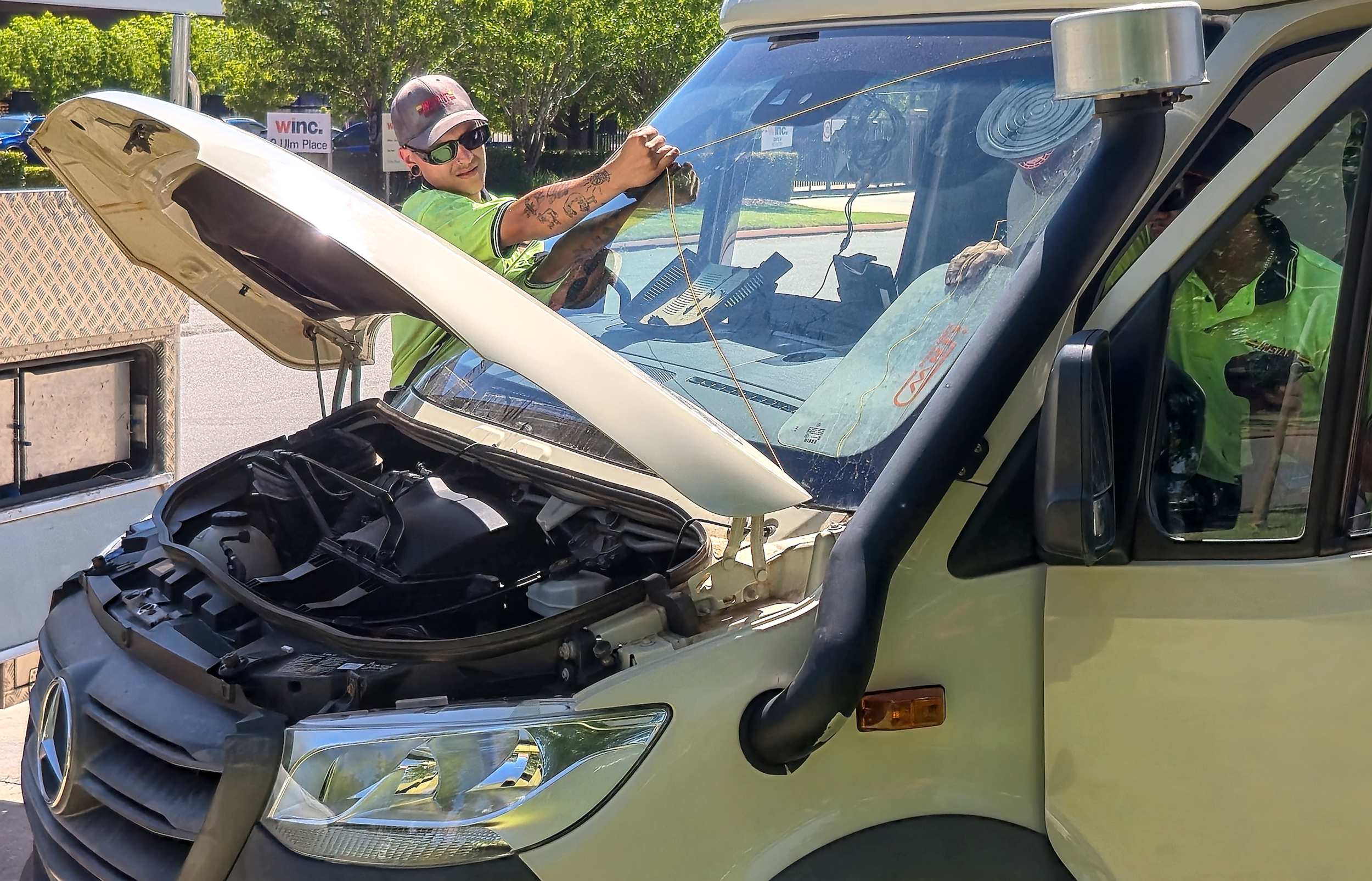 Bertha ist fertig und die richtige Scheibe geliefert, aber noch nicht eingebaut. Es gab Probleme mit dem Glaser, aber Mercedes organisiert eine andere Firma, die den Einbau vor dem inzwischen geschlossenen Tor, praktisch auf der Straße, noch am späten Heiligabendnachmittag vornimmt.