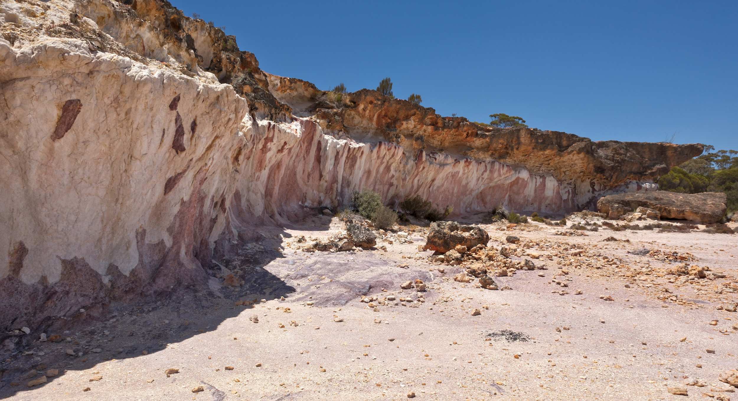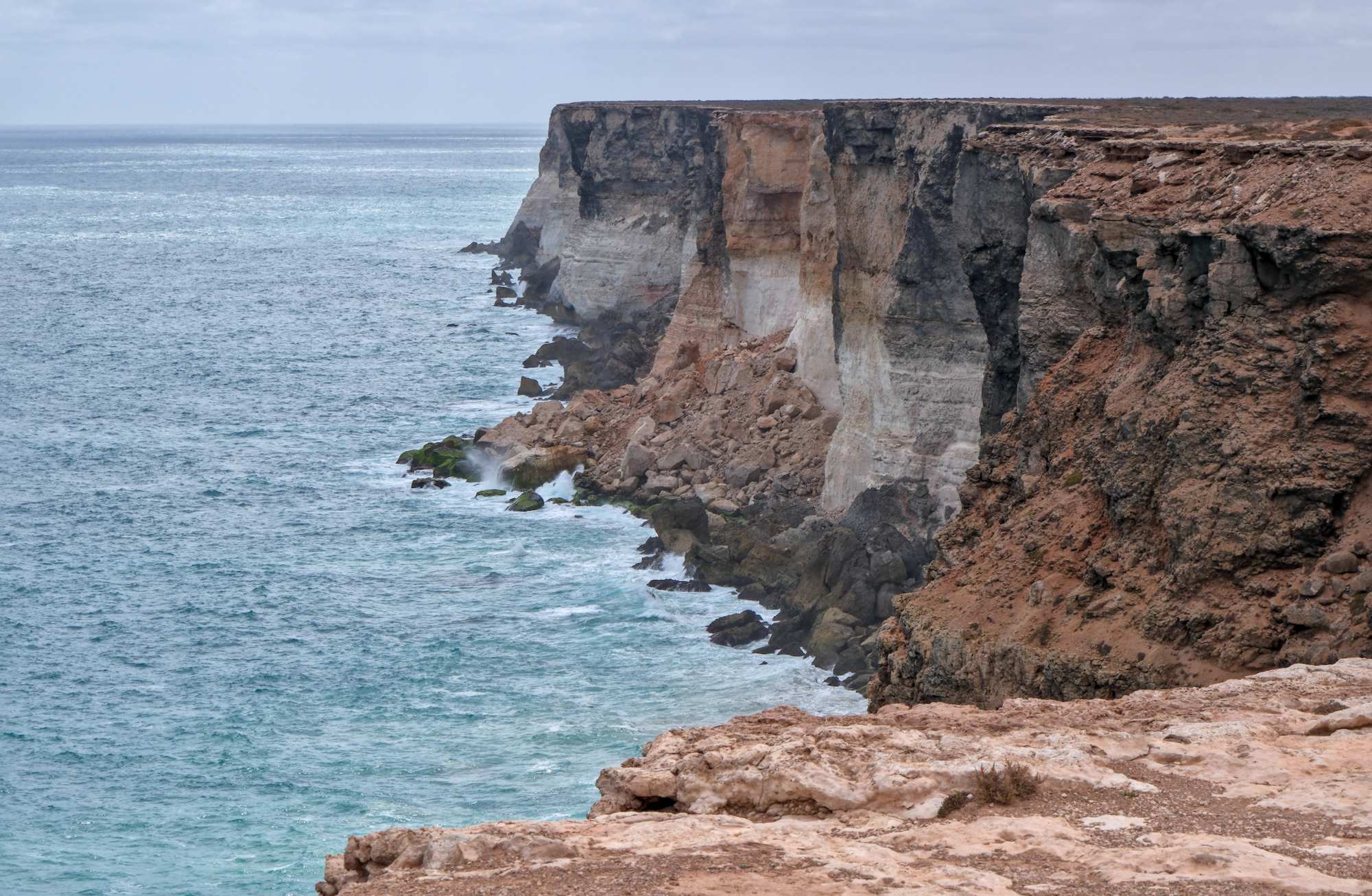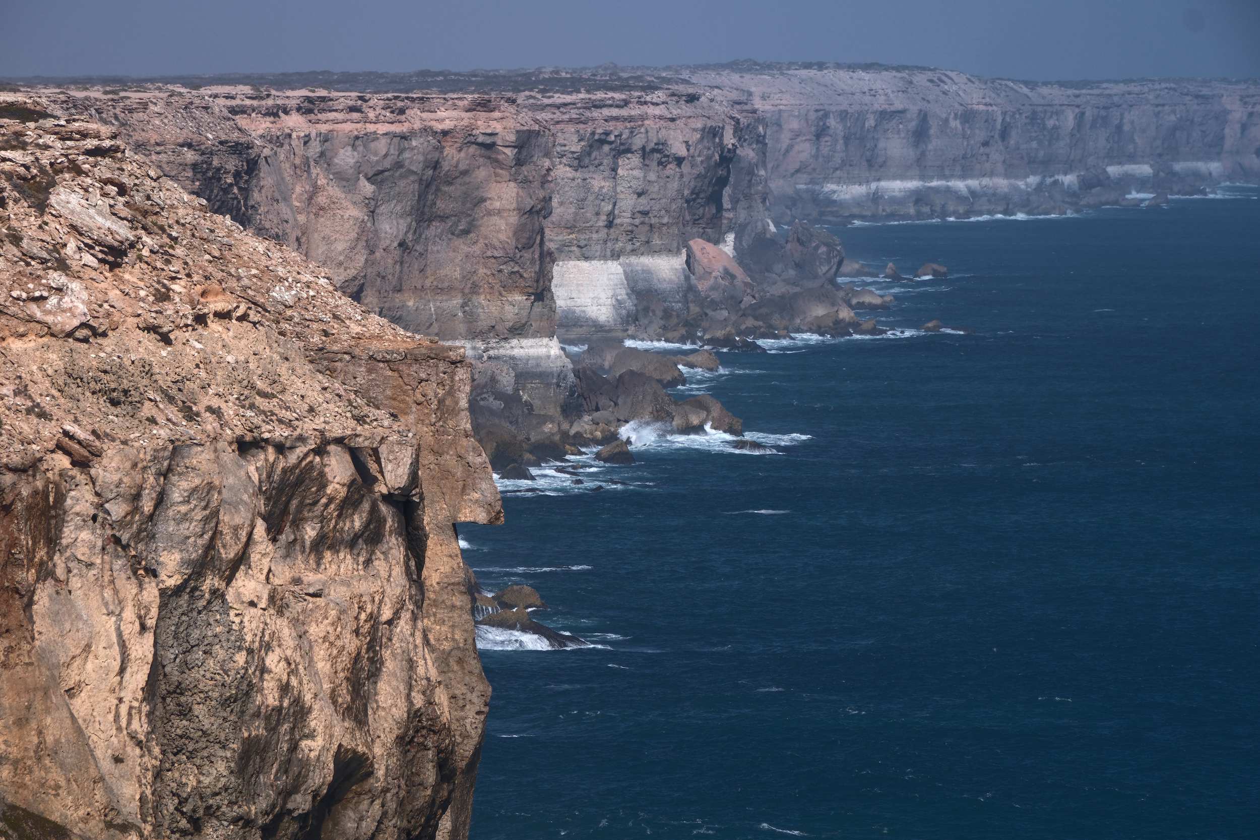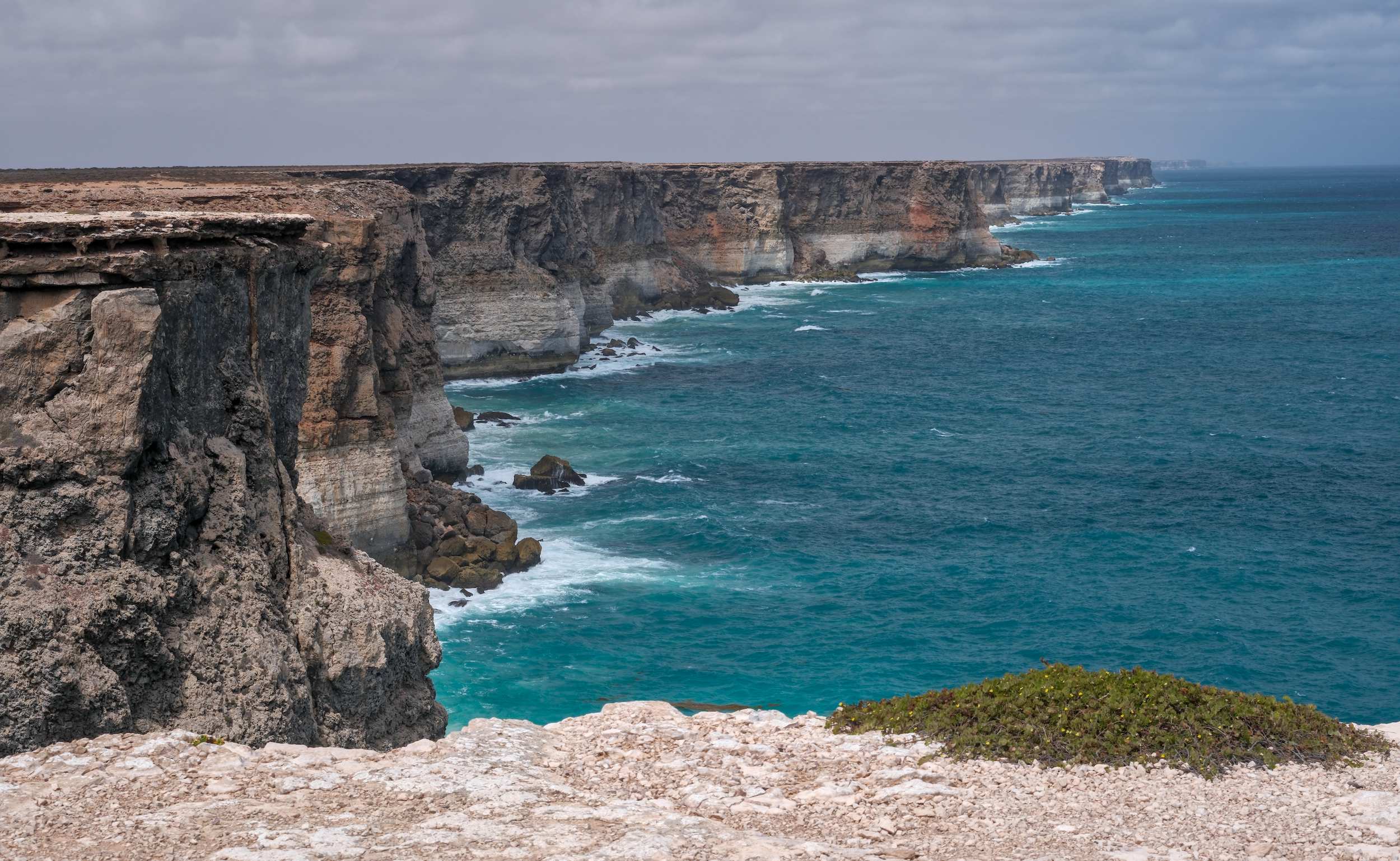 Diese beeindruckende, bis zu 120 m hohe, Steilküste, die 'Bunda Cliffs', erstreckt sich über 160 km entlang der 'Nullarbor Plain' und ist damit die längste ununterbrochene
