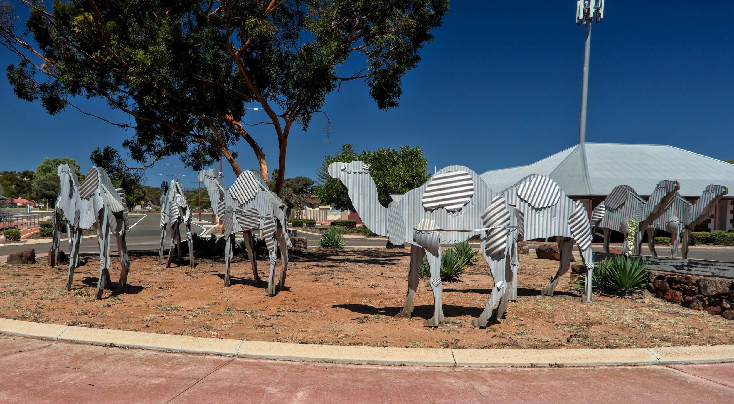 In Norseman gibt es eine kleinere Goldmine und einen Verkehrskreisel mit Wellblechkamelen.