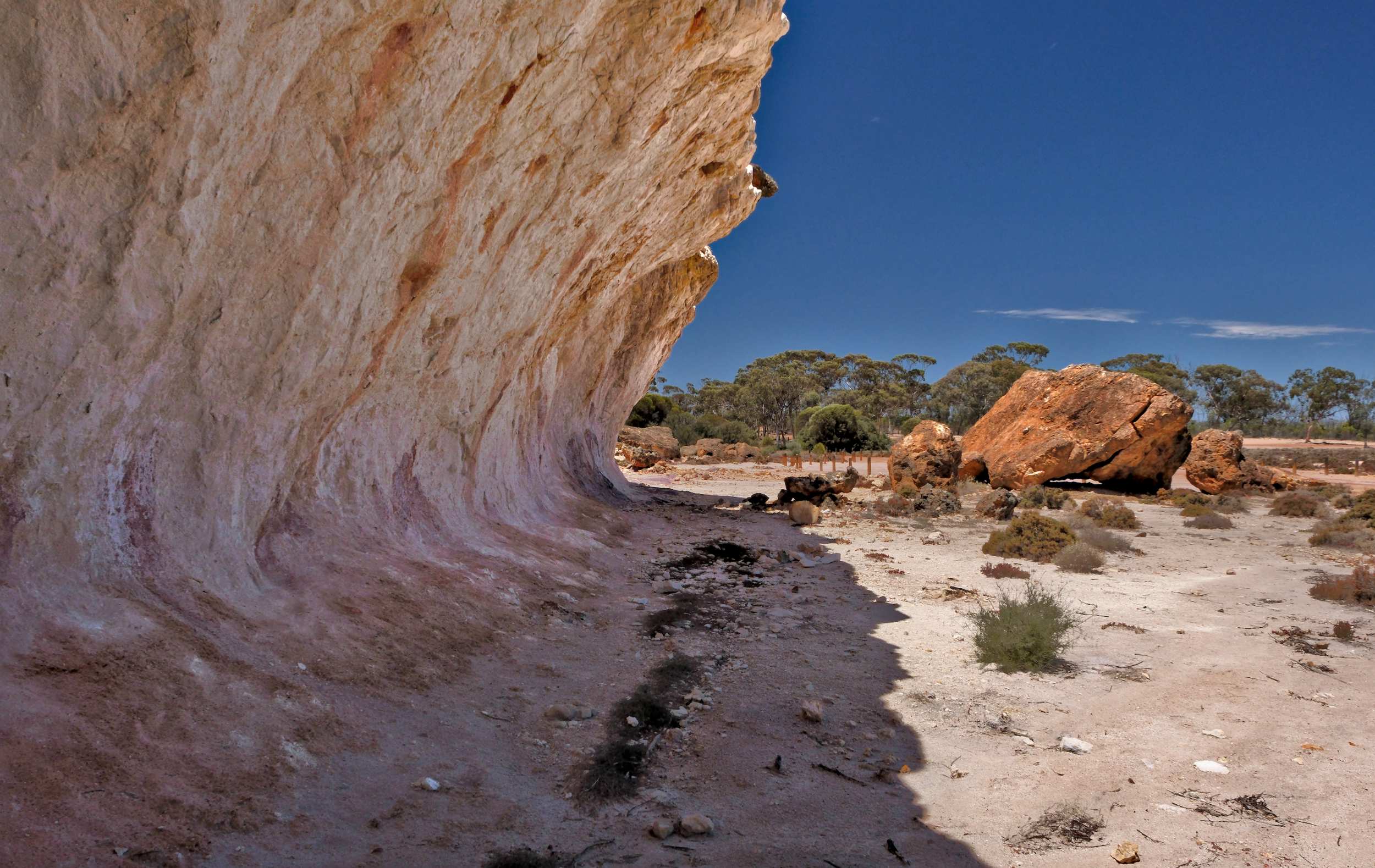 Am folgenden Tag über die Nullarbor-Ebene (Kein Baum- ) gefahren, eine weit ausgedehnte Karstwüste, mit rund 200.000 Quadratkilometern das größte Stück Kalkstein der Welt. Dabei die 'Scenic Lookouts Number 1 bis 3' plus weitere inoffizielle besucht. Fantastische Kliffküste, dagegen anrollend das Meer in unterschiedlichen blauen Farbtönen. Übernachtet dann kurz vor der Grenze zu West Australien (WA).