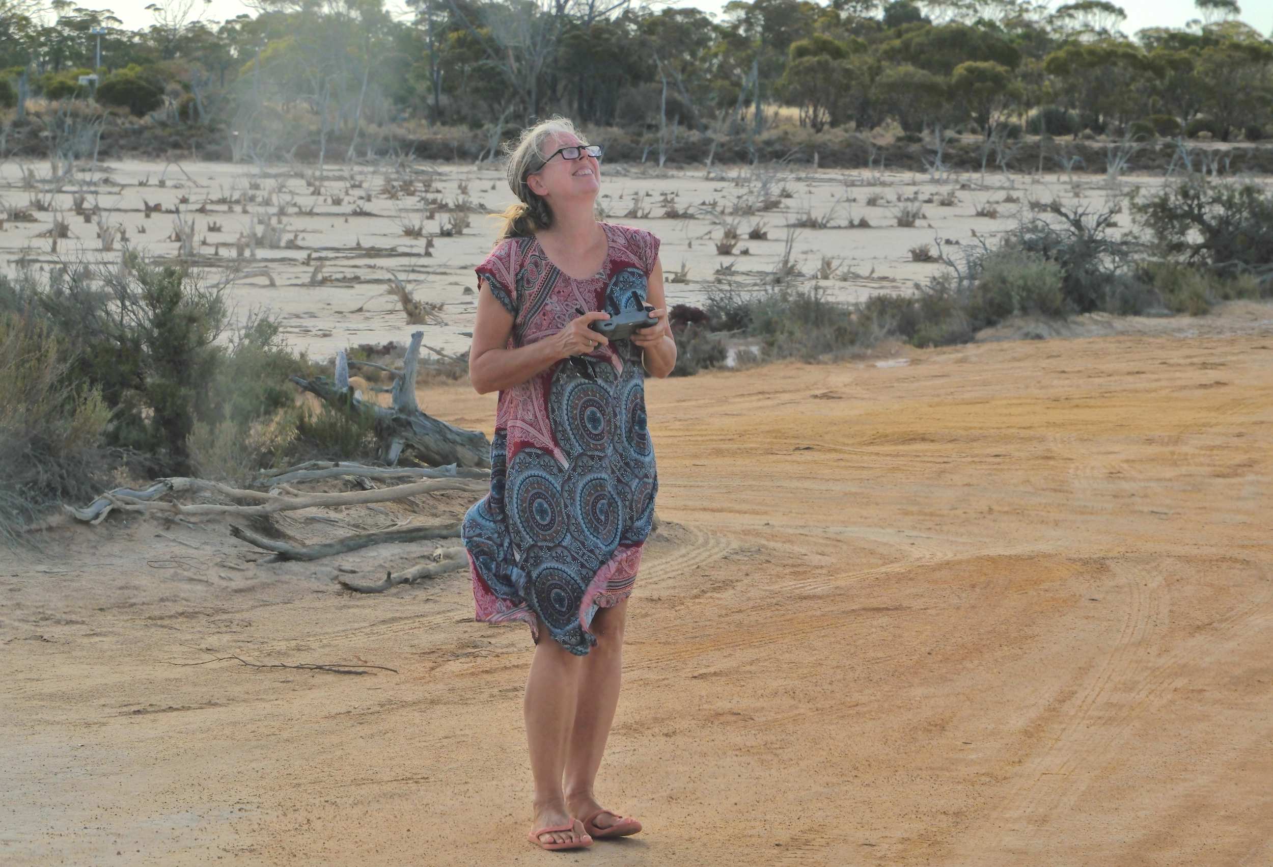 Nach dem Bad und gründlichem Abduschen lässt sie die Drohne schweben.