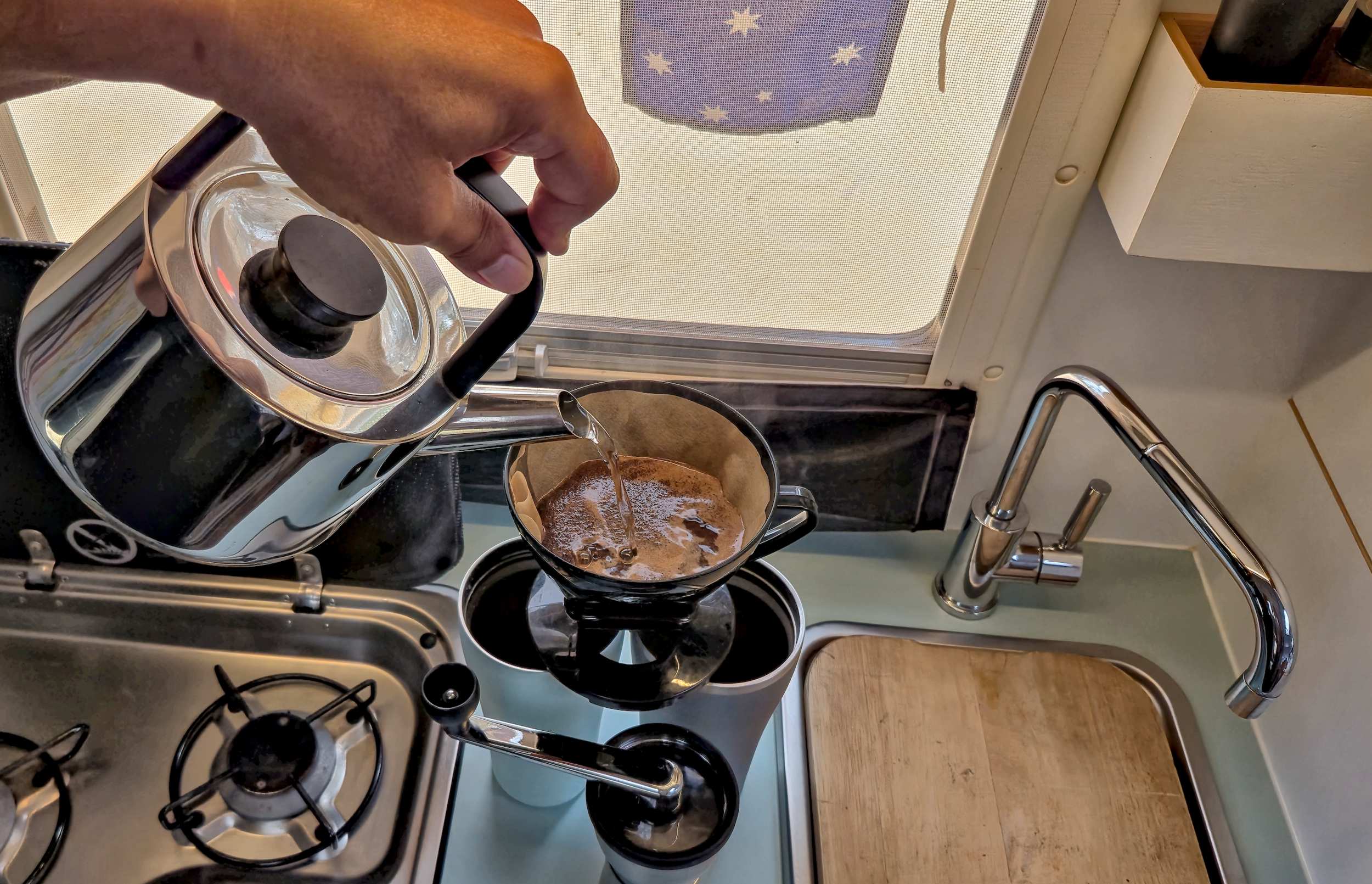 So machen wir unseren Kaffee: Frisch mahlen und aufbrühen.