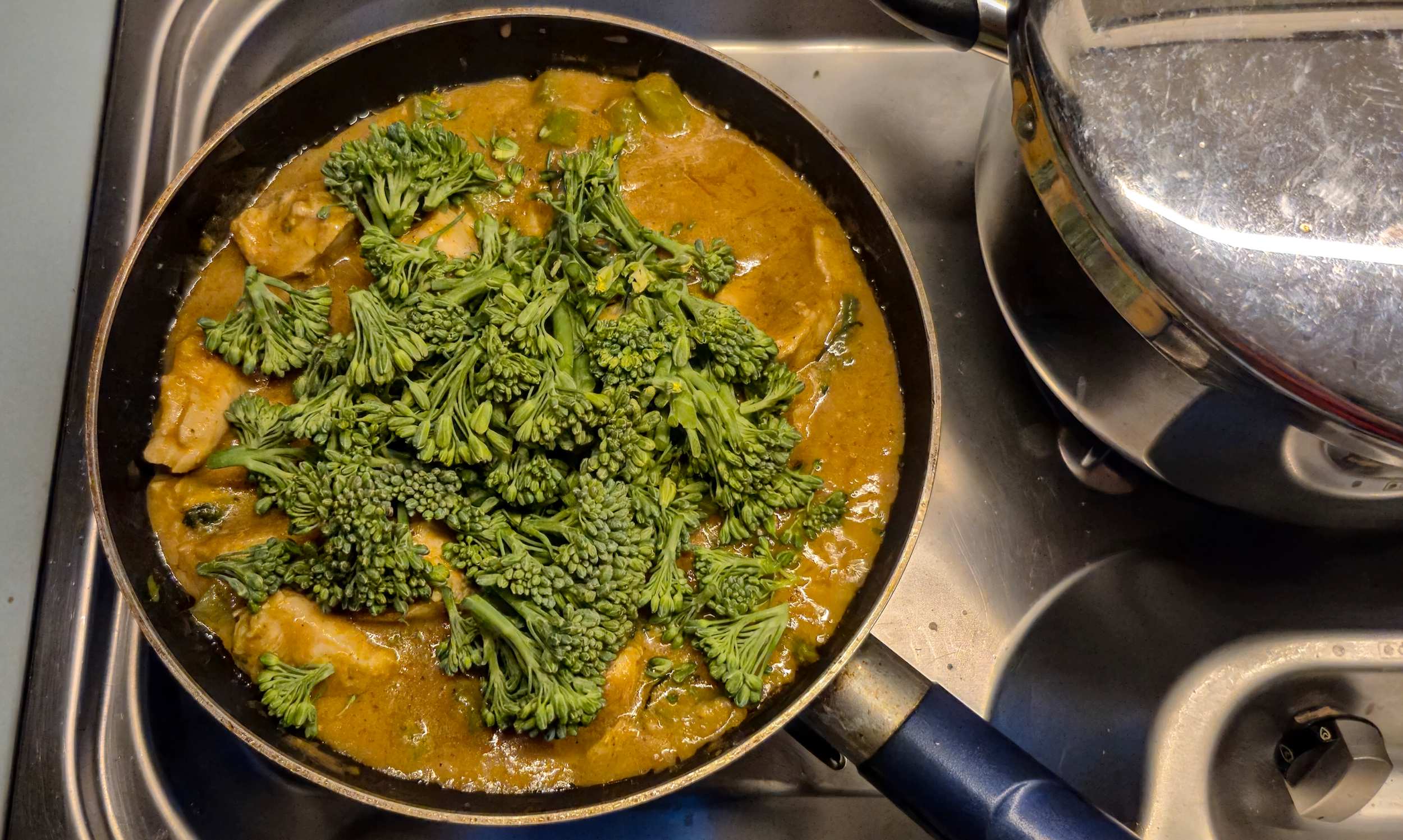 Pfanne mit Butterchicken und Brokkoli, dazu Reis aus dem Schnellkochtopf.