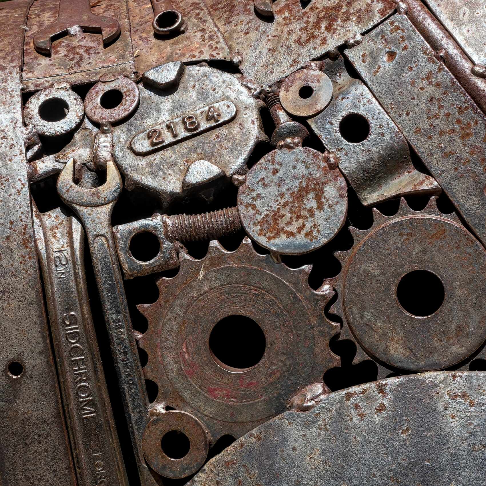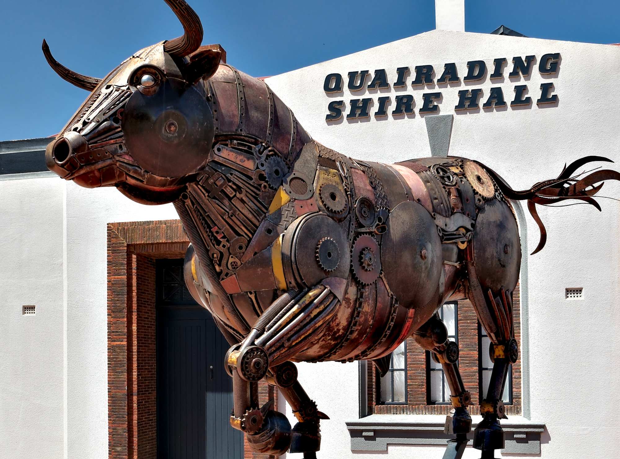 Der 'Angusbulle' in Quairading vom gleichen Künstler, gefertigt aus einer halben Tonne ausrangierter Werkzeuge, Maschinenteile und landwirtschaftlichem Schrott.