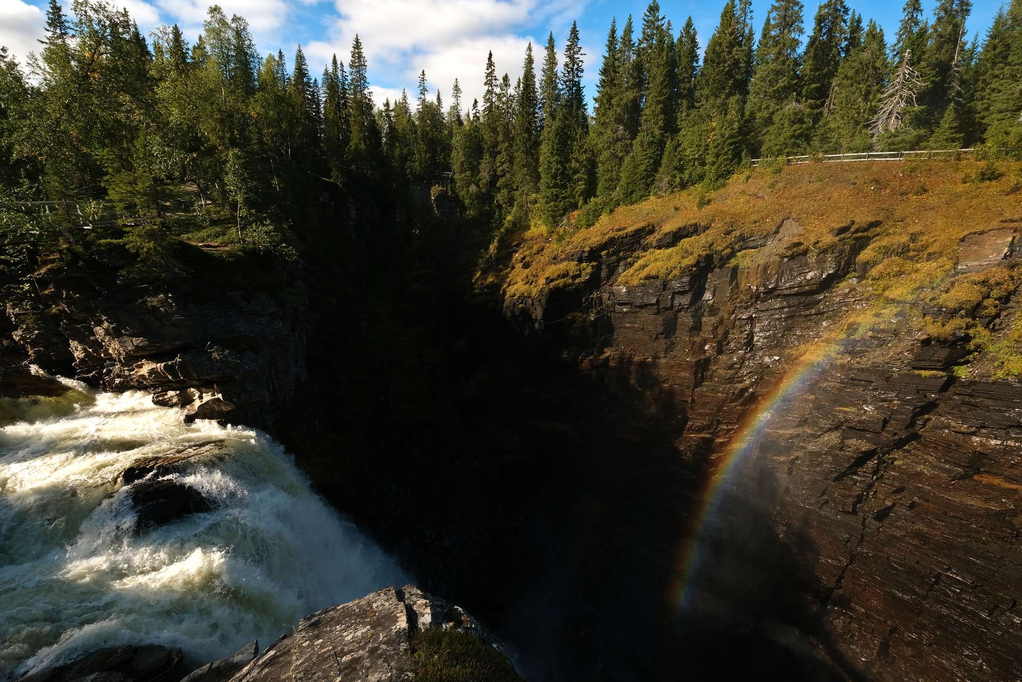 Auch hier, noch lange nicht "hoch im Norden", sind die Straßen abseits der Hauptrouten ungeteert. Diese führt uns zum Hällingsåfallet (Wasserfall), der sich aus gut 40 m Höhe in seinen grandiosen Canyon stürzt. Die Schlucht wird von bis zu 60 m hohen Wänden begrenzt.