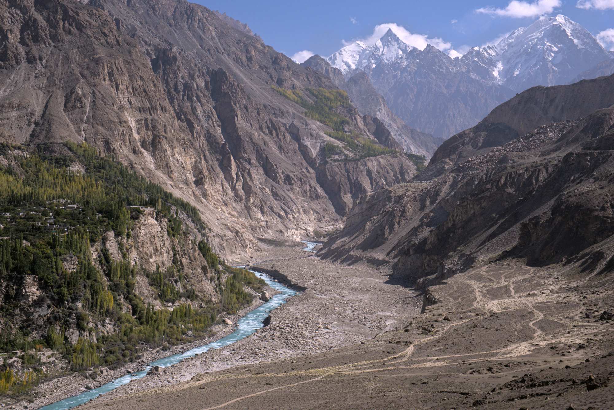 Auf der Rückfahrt nach Gilgit kommen wir noch einmal am Attabadsee vorbei, der durch diesen riesigen Felssturz (helles Gestein) im Januar 2010 entstanden ist. Dadurch war auch der Karakorum-Highway nicht mehr befahrbar. Ein Bootsverkehr wurde eingerichtet und kleinere Fahrzeuge recht abenteuerlich "verschifft". Die Chinesen, die in Pakistan generell sehr engagiert sind und auch diese Fernstraße gebaut haben, stellten fünf Jahre später durch mehrere Tunnel die Verbindung wieder her.