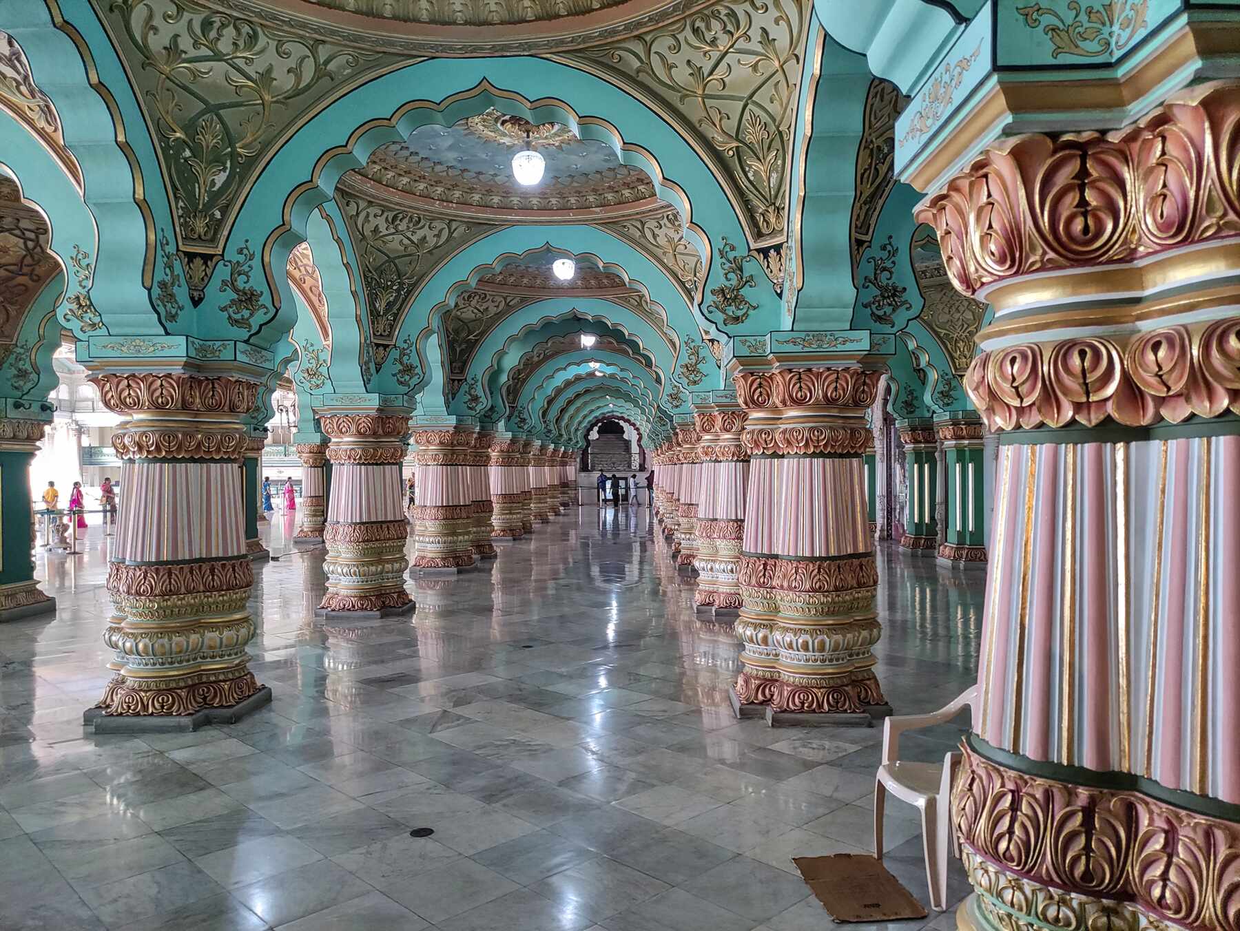 Dann besuchen wir doch noch den Palast Amba Vilas, in dem heute noch Nachfahren des Maharadschas wohnen. Er zählt zu den berühmtesten Palastbauten Indiens. Übrigens gibt es hier auch einen Stall mit Elefanten, die für die prachtvollen Paraden gebraucht werden.