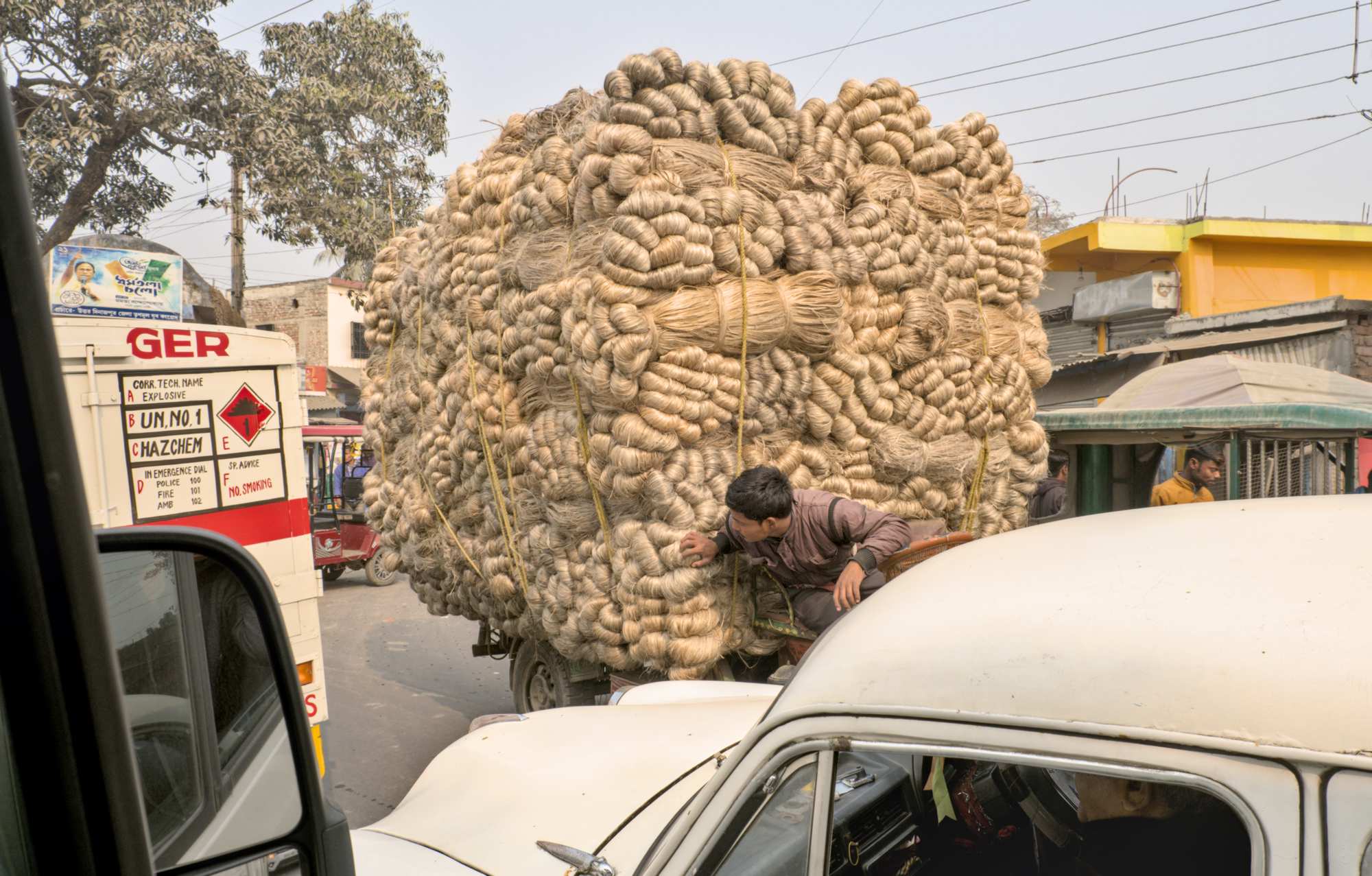Was so alles transportiert wird: Schickes Pferd, fahrender Heuhaufen, etwas größere Reifen und in Überbreite irgendein Teil. Hier in Indien nicht mal besonders gekennzeichnet, geschweige denn von einem Begleitfahrzeug gesichert.