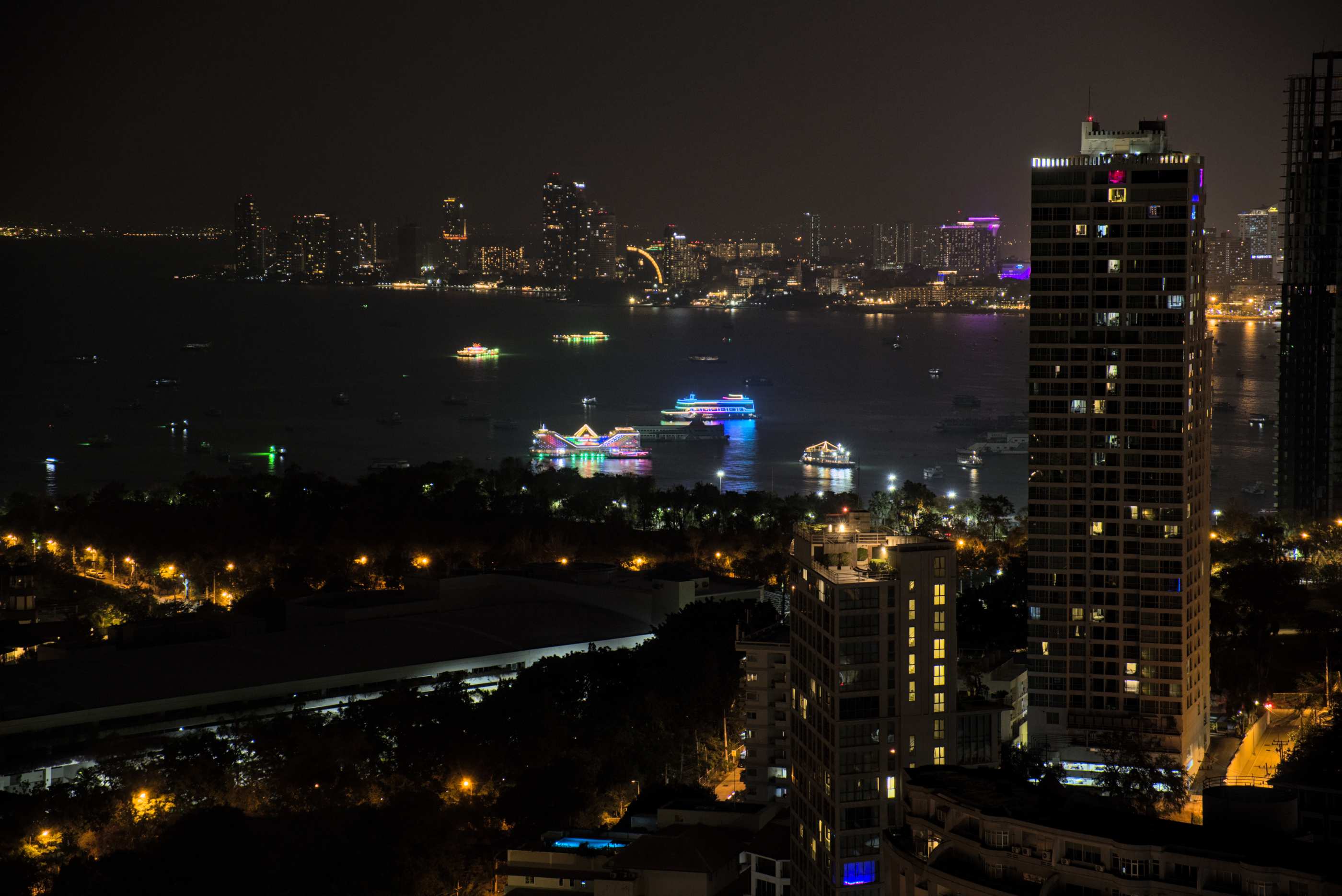 Zwei Nächte sind wir nun hier im Süden Pattayas. Unsere Ferienwohnung mit Balkon im Andromeda Condominium liegt im 34. Stock, an zwei Seiten fast rundum bodentief verglast mit herrlicher Sicht auf Pattaya und das Meer, selbst von den Betten und Bädern aus. Über uns nur noch ein Stockwerk und dann das Rooftop. Murmel hat ein eigenes Schlafzimmer mit Doppelbett und Bad.