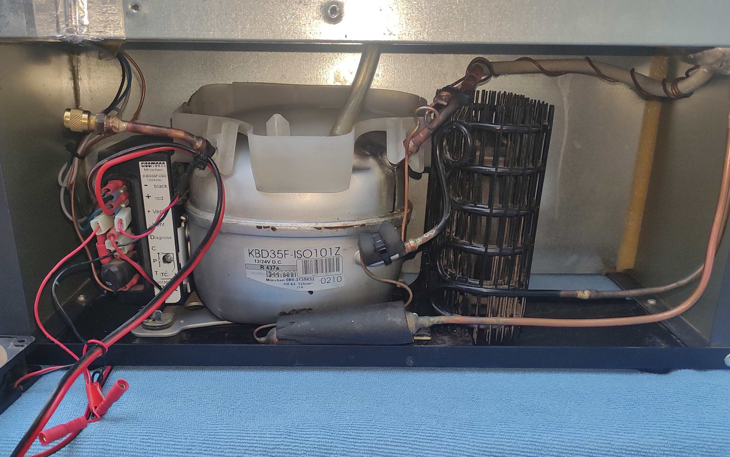 Der Kühlschrank wurde repariert (Kupferrohrbogen mit Riss erneuert, wiederauffüllen mit Kühlflüssigkeit usw.), wir haben ihn wieder eingebaut, eingeräumt, die fette Kühlbox aus Bertha gewuchtet und ca. € 400 bezahlt. Leider hat er in der Nacht schon wieder den Geist aufgegeben. Am nächsten Tag dann Telefonat mit der Werkstatt und abends mit dem Hersteller in München. Der brauchte Fotos, also Kühlschrankinhalt in das Campingplatzkühlgerät, unseren wieder ausgebaut, hinten fotografiert und auf dem Beifahrersitz plaziert.