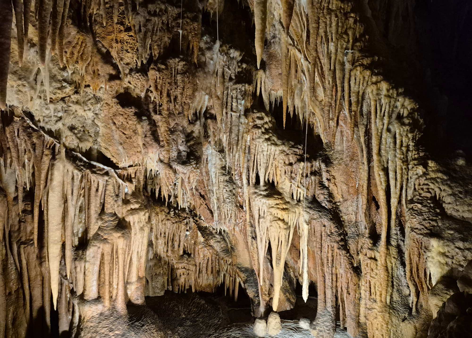 Das sind keine Kabelreste, sondern filigrane Stalaktiten. Im nächsten Foto hat die Natur ein "Geschirrhandtuch" an die Decke gezaubert.