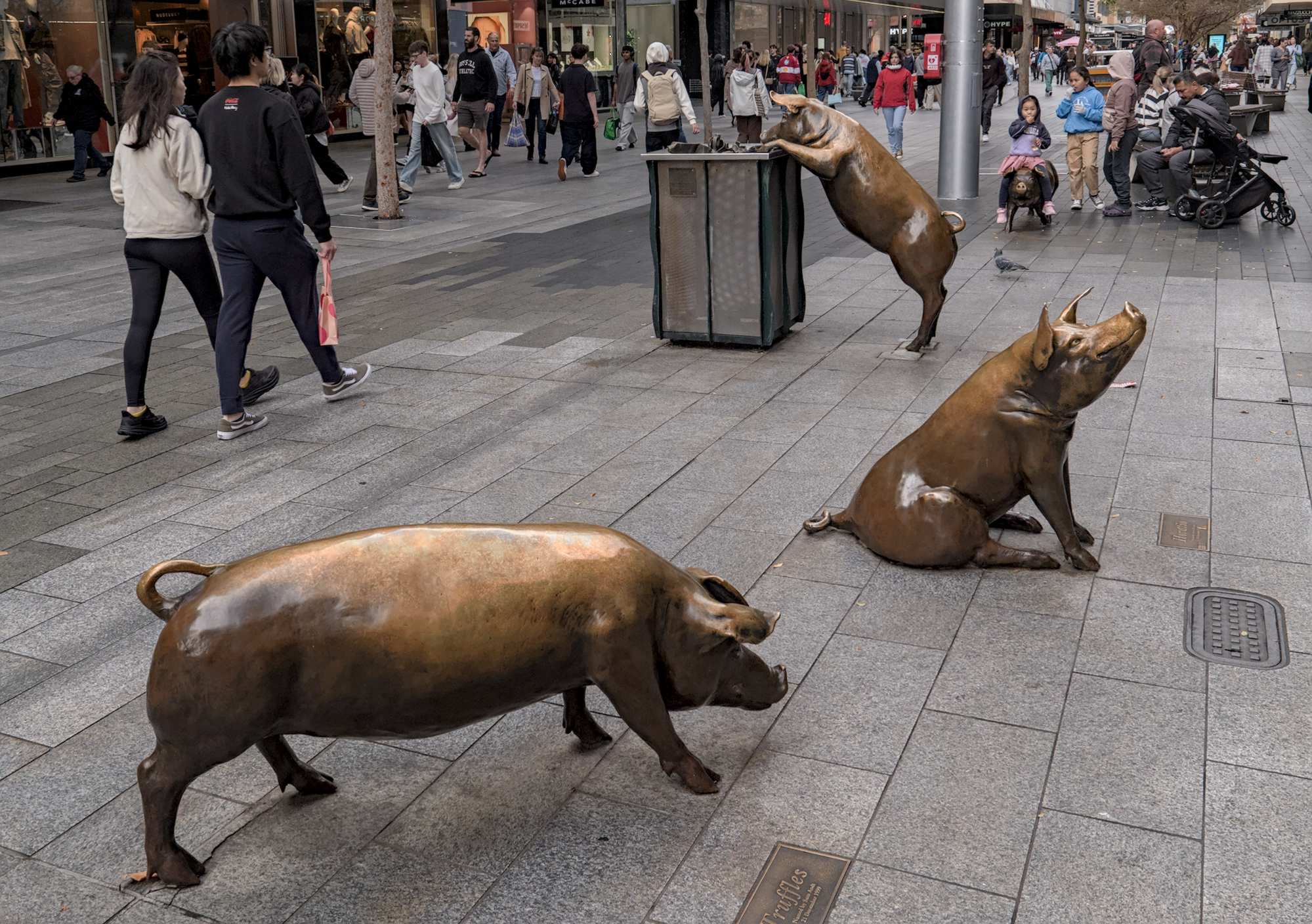 'A Day Out' (Ein Tag draußen): Lebensgroße Schweine aus Bronze der Künstlerin Marguerite Derricourt von 1999 in der Fußgängerzone 'Rundle Mall'.