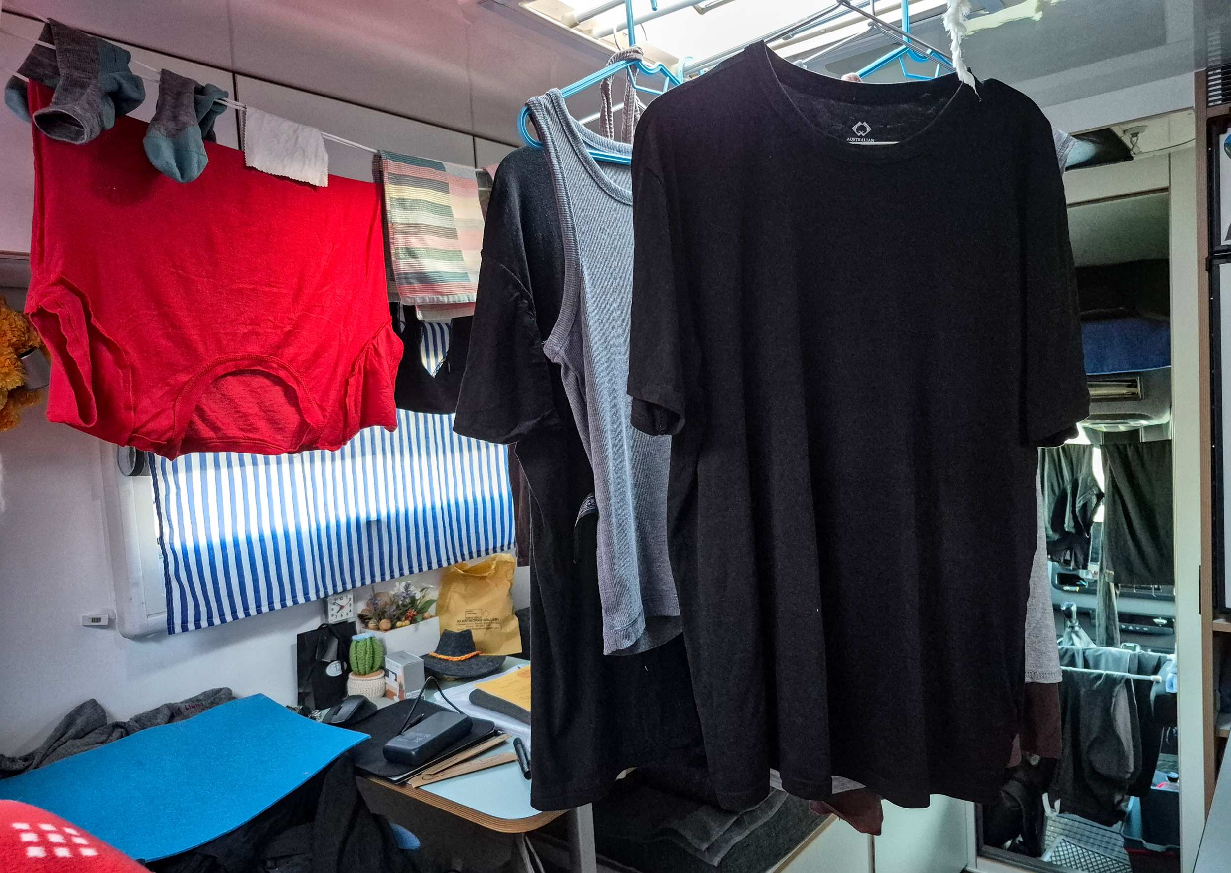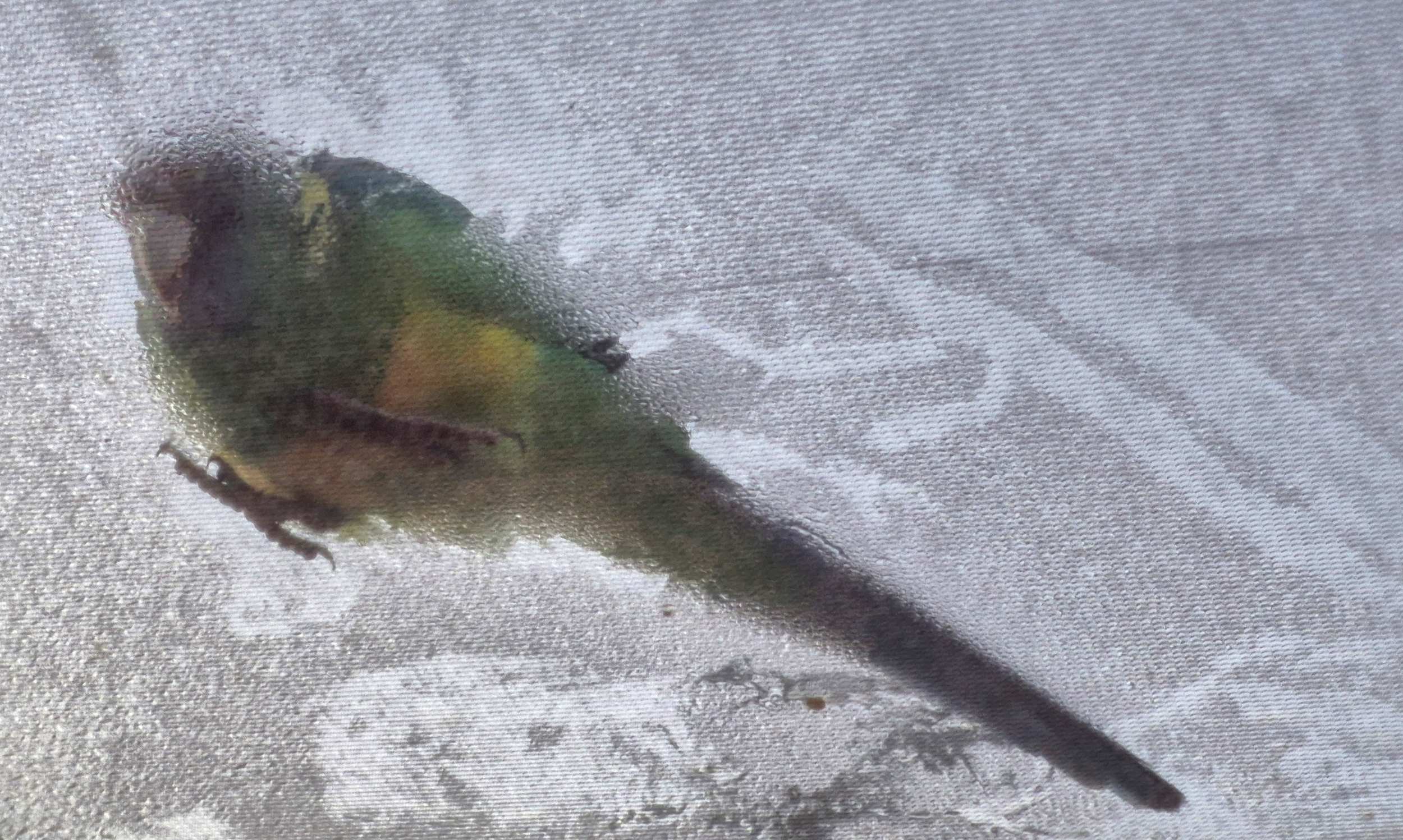 Am nächsten Morgen kommt uns ein Sittich besuchen, der den Tau auf unserer Panoramascheibe über dem Bett ablutscht.