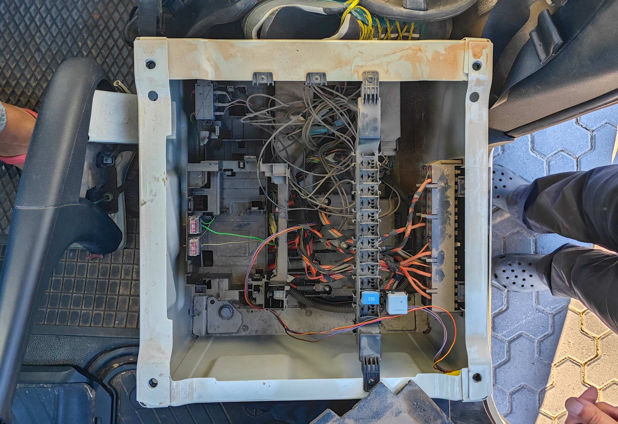 Zwischendurch "schrauben" wir auch 'mal an Bertha. Der Fahrersitz wird ausgebaut, darunter sieht es furchtbar aus. Lösung: Ganz schnell wieder einbauen und erstmal verdrängen. Naja, wir haben schon den Kabelsalat etwas geordnet und ein wenig Staub gewischt.