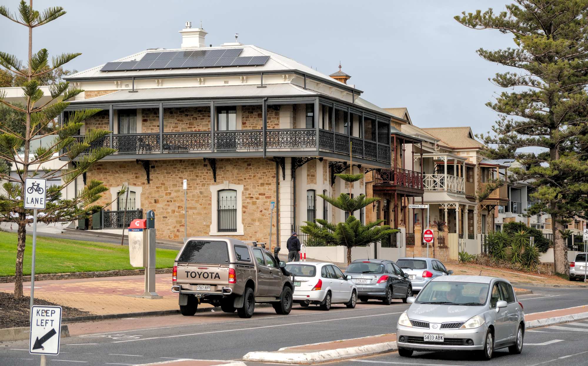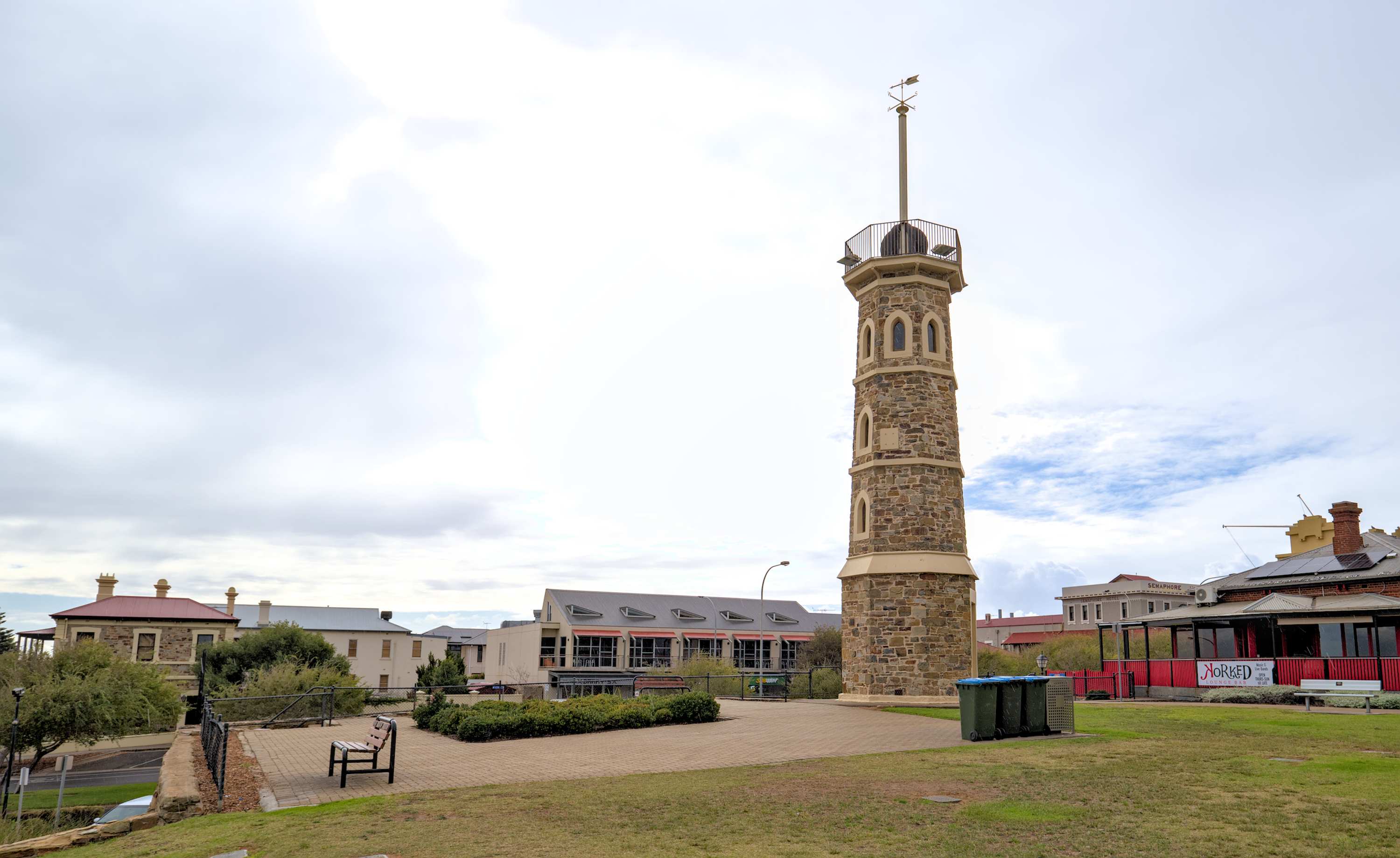 Ein Eckhaus im Stadtteil Semaphore und das namensgebende Gebäude, genannt 'Time Ball Tower' (Zeitballturm) von 1875, wo bis 1932 immer von exakt 12:57 bis 13:00 Uhr ein Ball hochgezogen wurde, damit die Schiffe im Hafen ihre Chronometer abgleichen konnten.