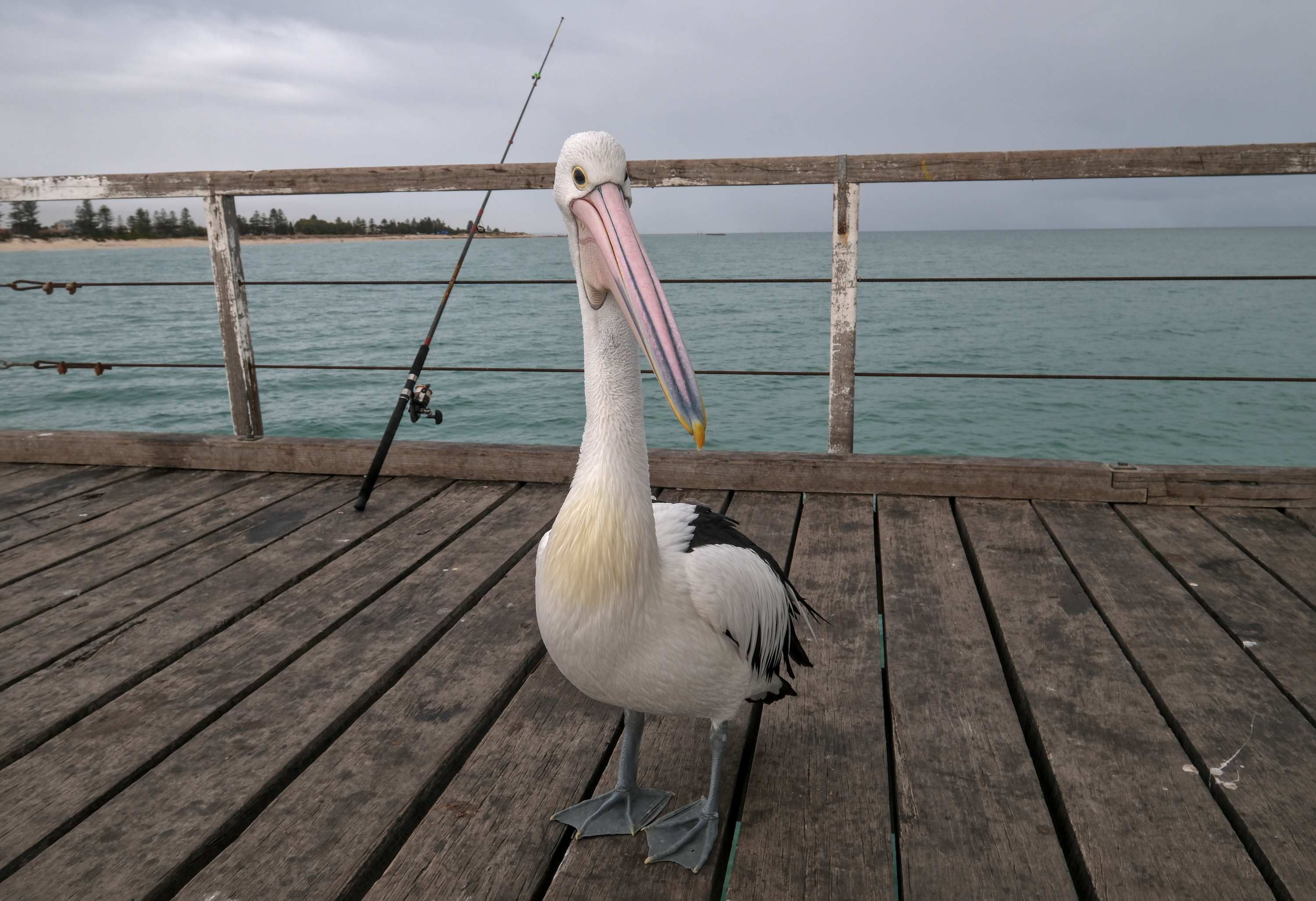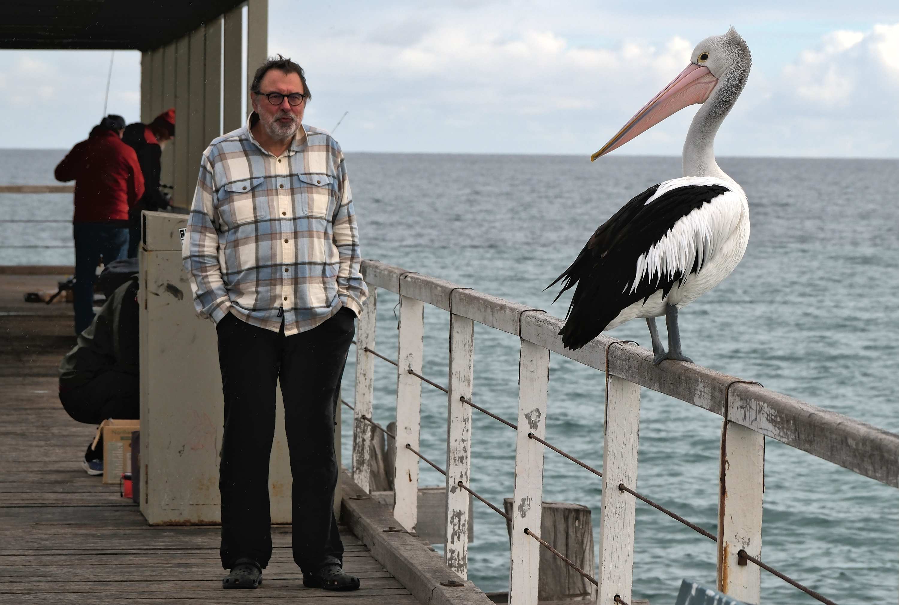 Auf der dortigen Seebrücke pfeift Wilhelm einem interessierten Pelikan etwas.