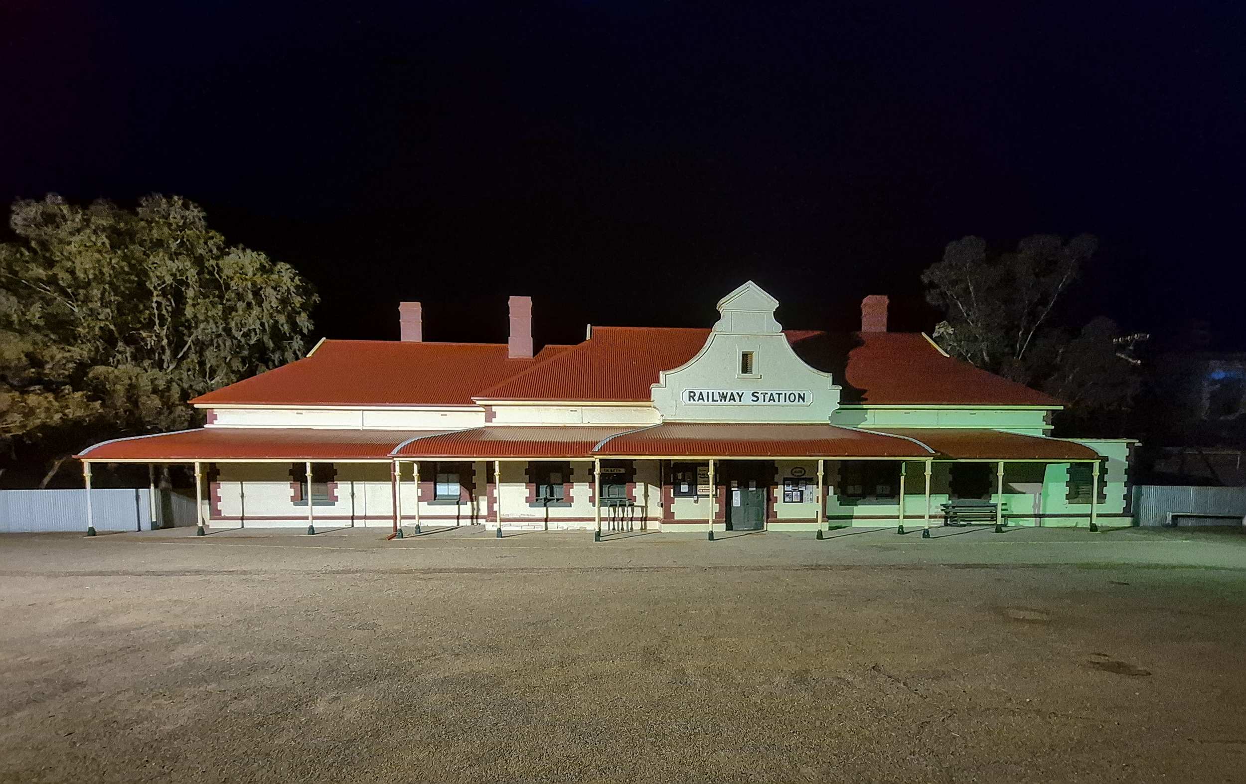 Bahnhof und 'Transcontinental Hotel' (mit super Hähnchenschnitzel!) machen sich gut bei Nacht.