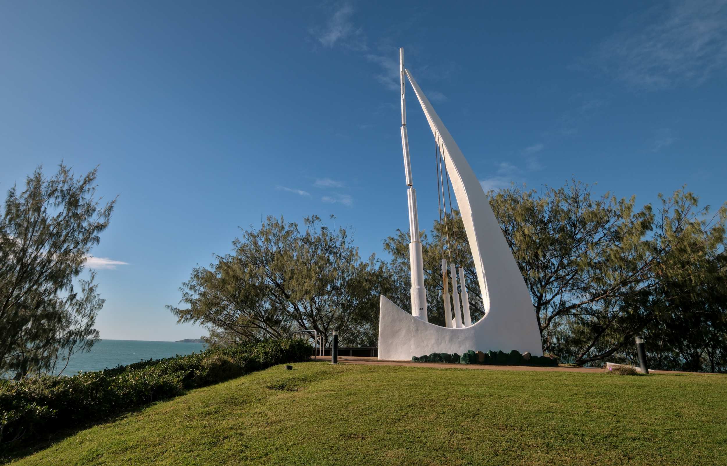 Küste vor 'Emu Park' und das dortige 'Singing Ship' (Singendes Schiff), Denkmal für Kapitän James Cook, das bei Wind, und der weht hier immer, wirklich "singt".