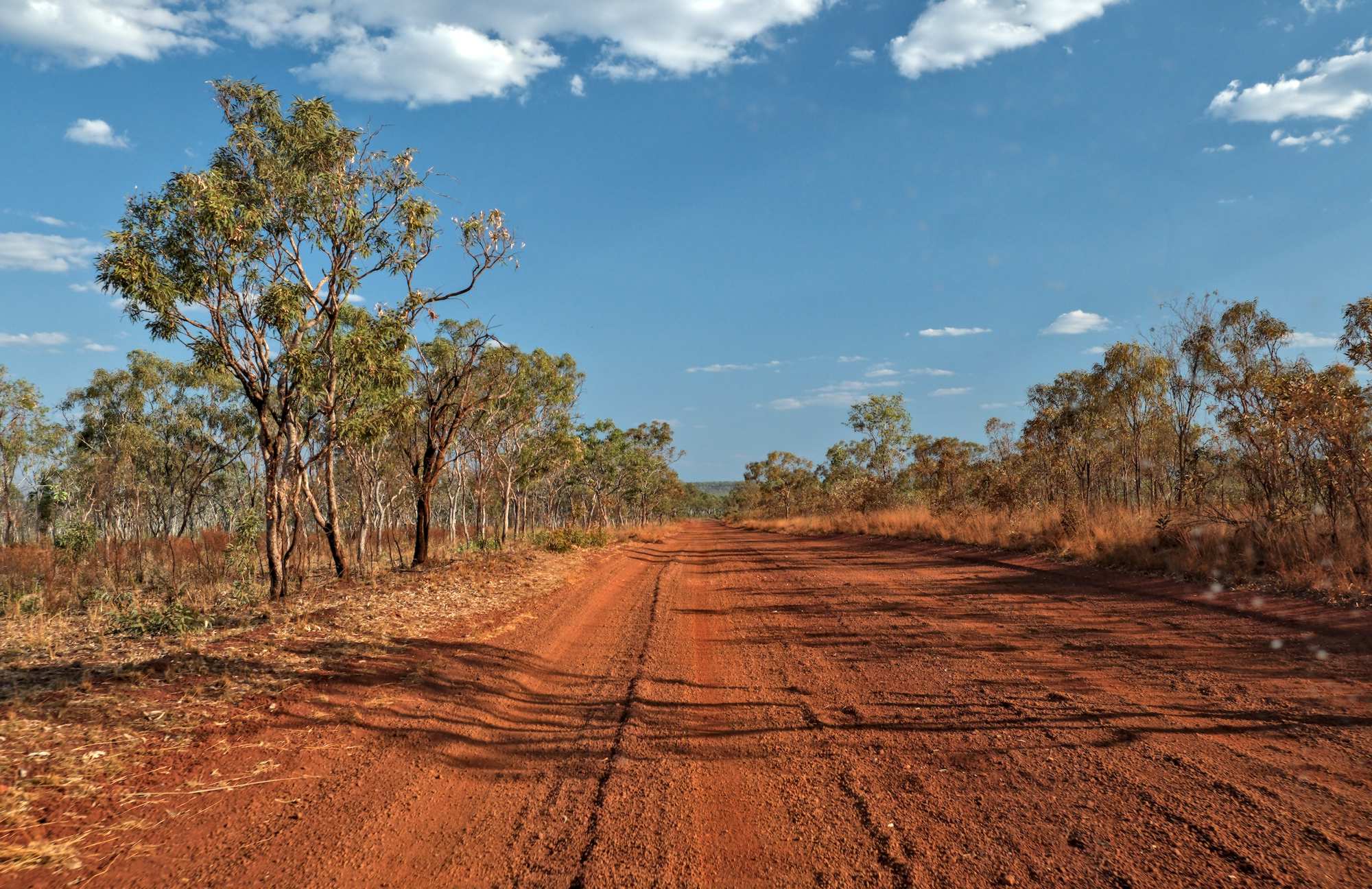 Gut 120 km sind zunächst ziemlich wellig und steinig, dann kommt rote Erde, auch Waschbrett, aber besser zu fahren.