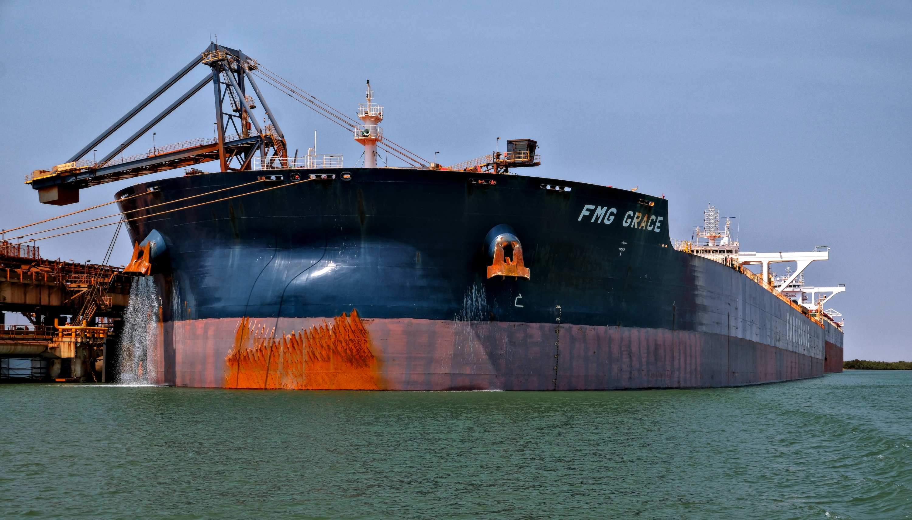 Im Vordergrund die 'FMG Grace', ein Bulkcarrier (Massengutfrachter) mit 327 m Länge, 57 m Breite und rund 260.000 t Zuladung. 9 Züge mit jeweils zwei Kilometer Länge müssen anrollen, um ihn zu füllen.