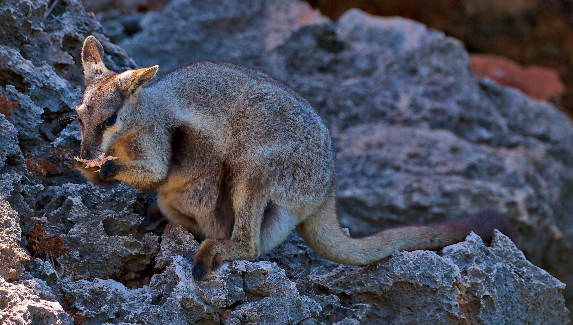 Auf einem kleinen Boot unternehmen wir eine schöne Tour auf dem besagten Creek und treffen u. a. auf diese Schwarzfuß-Felsenkängurus.
