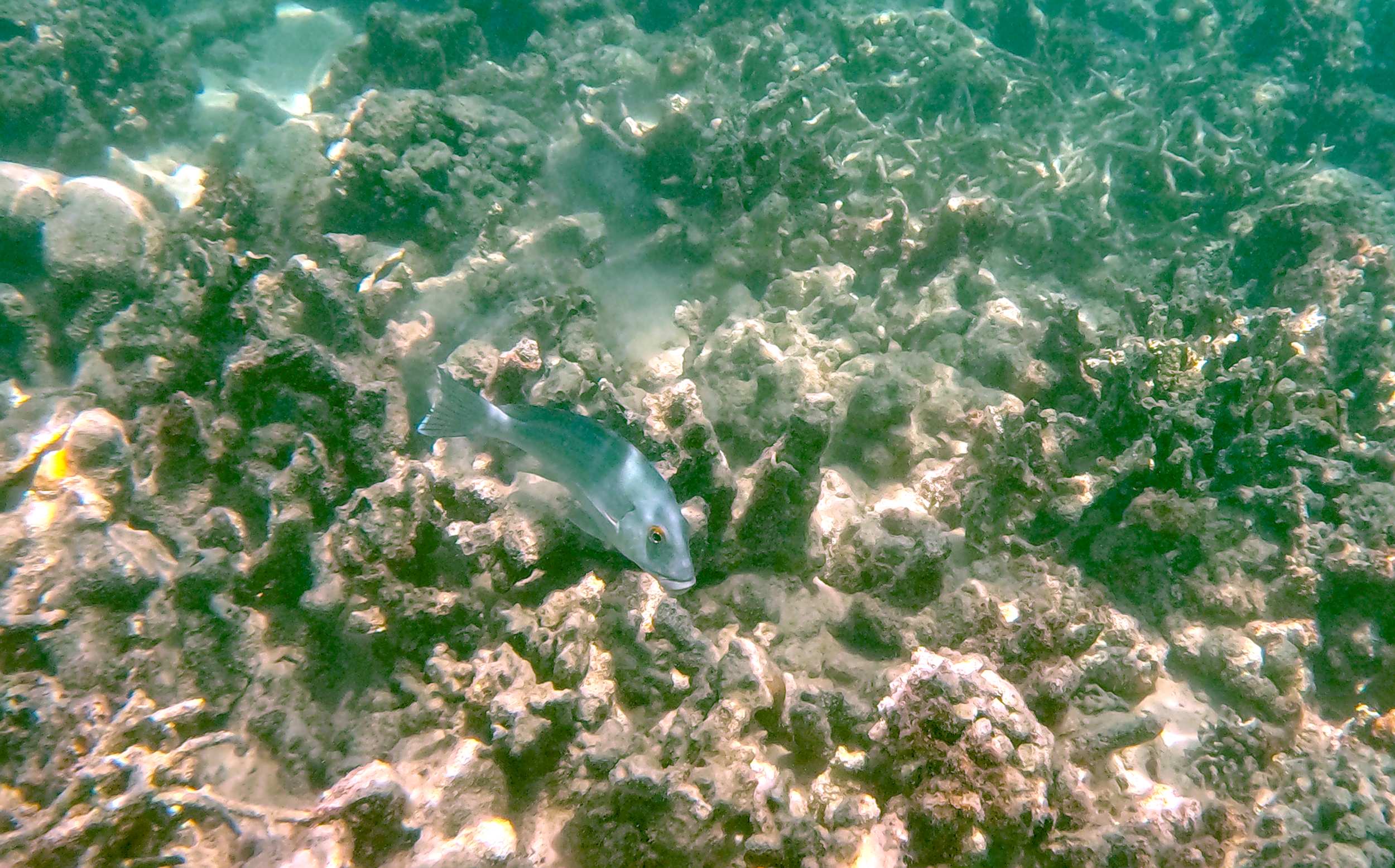 Ulrike geht noch einmal zwischen den kranken, gebleichten Korallen Schnorcheln. Viele Fische sind eingewandert, die Algen fressen und somit helfen, dass sich die Kolonie erholt.