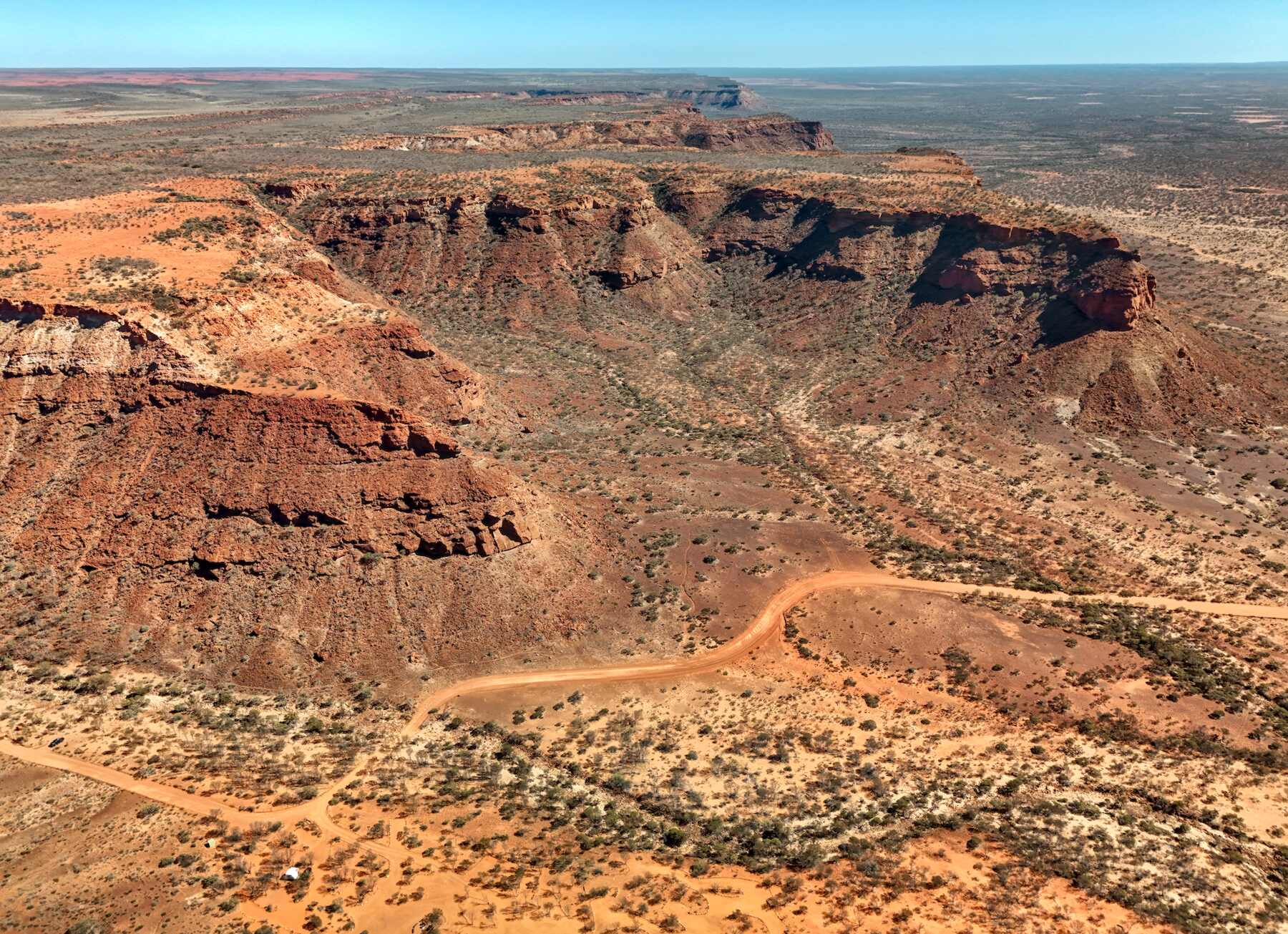 Die Drohne zeigt einen Teil des Plateaus und der Abbruchkante der 'Kennedy Range'.