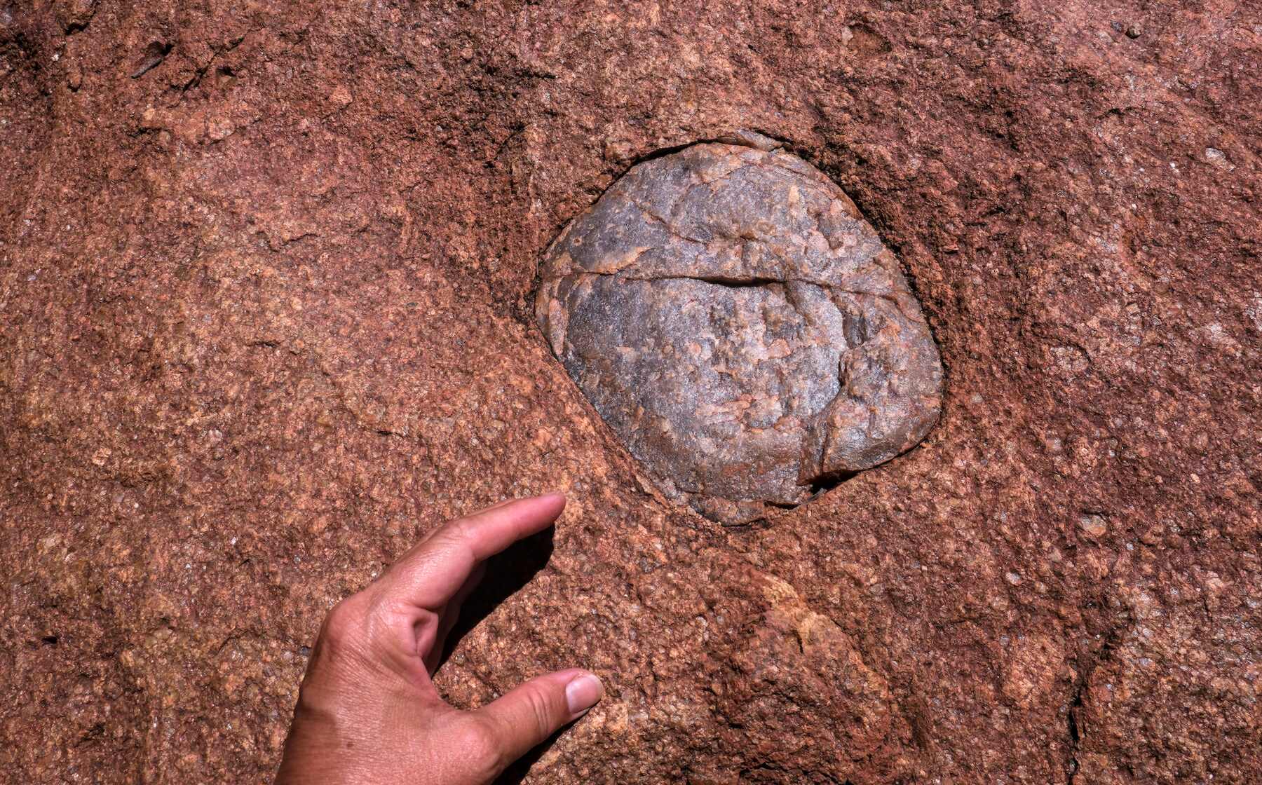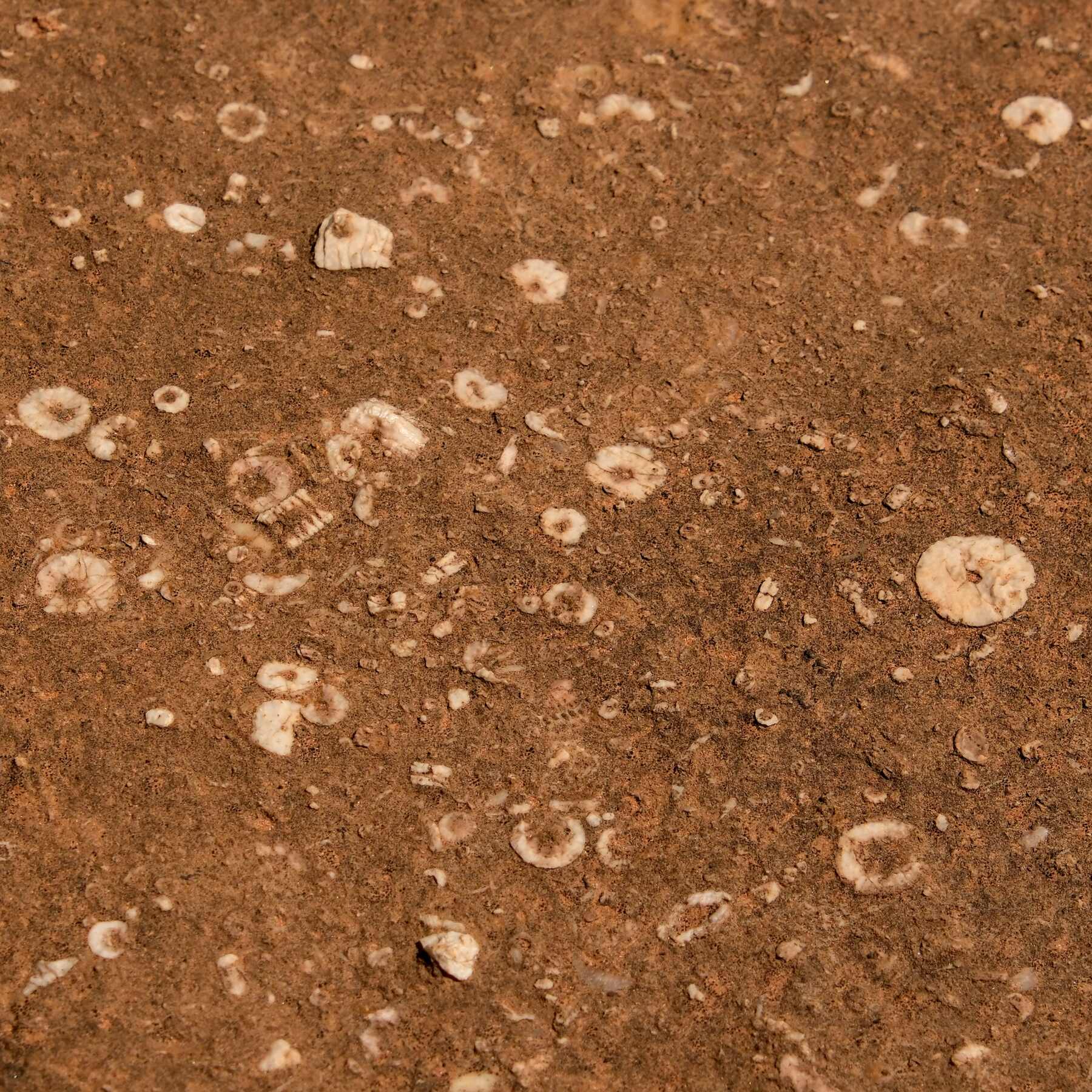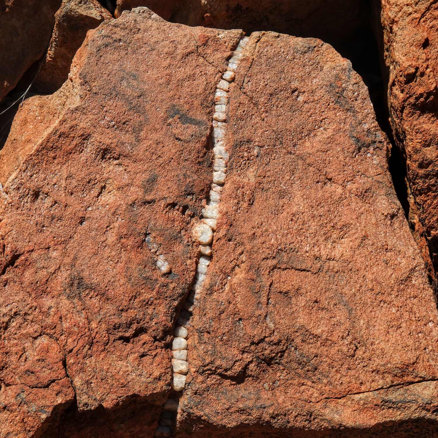 Neben der Straße eine Sehenswürdigkeit: Fossilhaltiges Sedimentgestein.