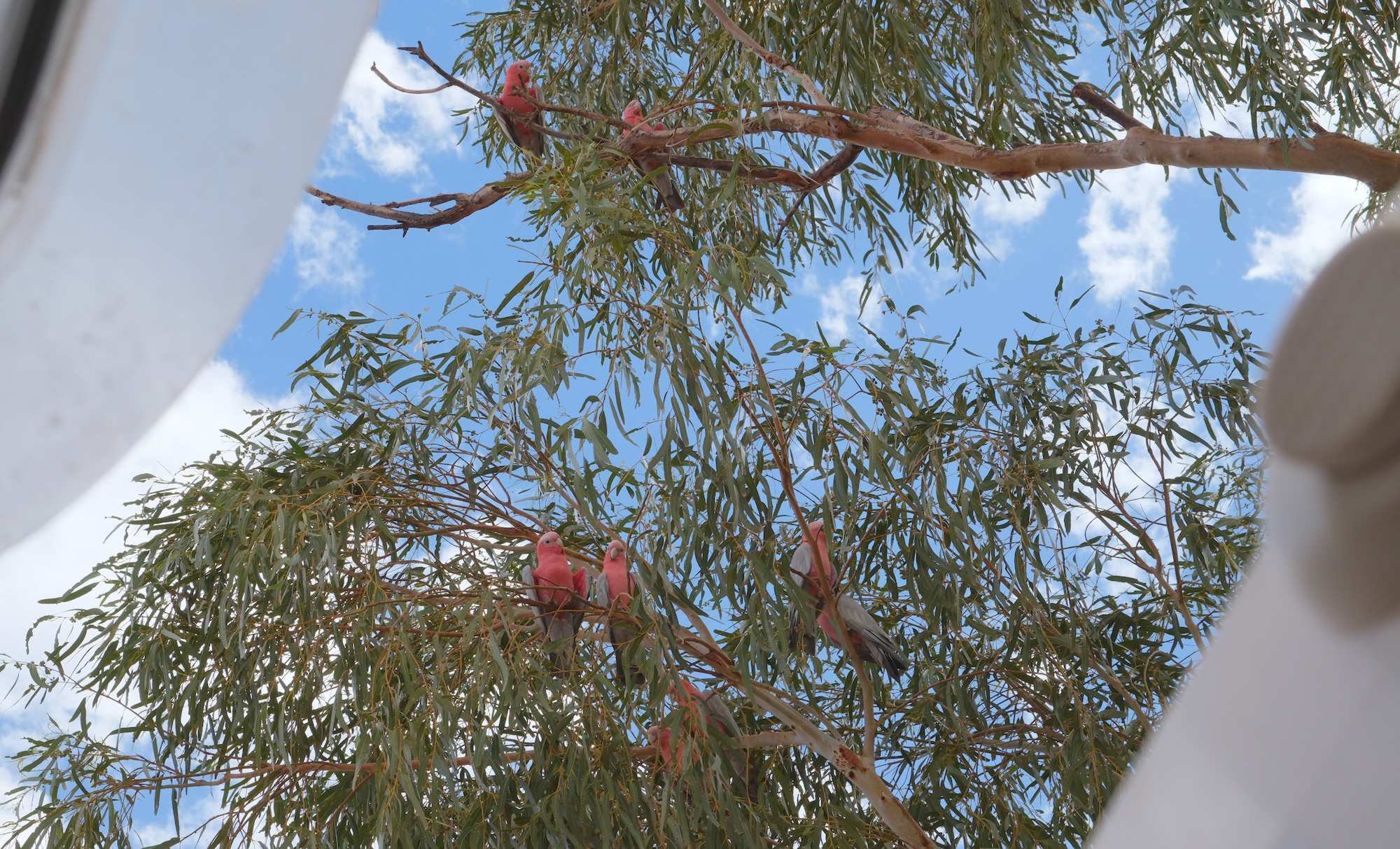 Im 'Mount Augustus Tourist Park', wo wir übernachten, betrachten uns diese Rosakakadus während ihres Mittagsruhe ab und zu durchs offene Dachfenster.