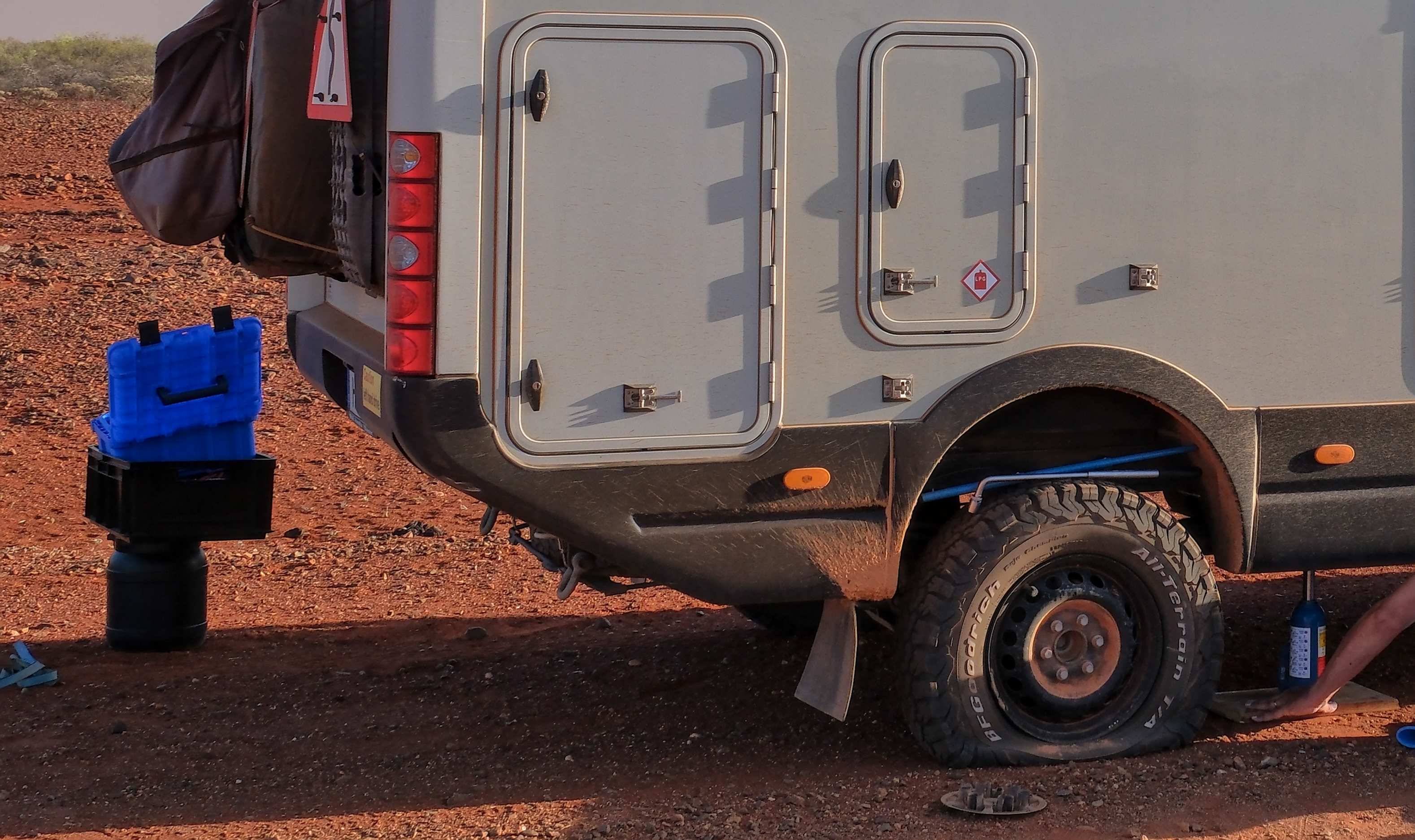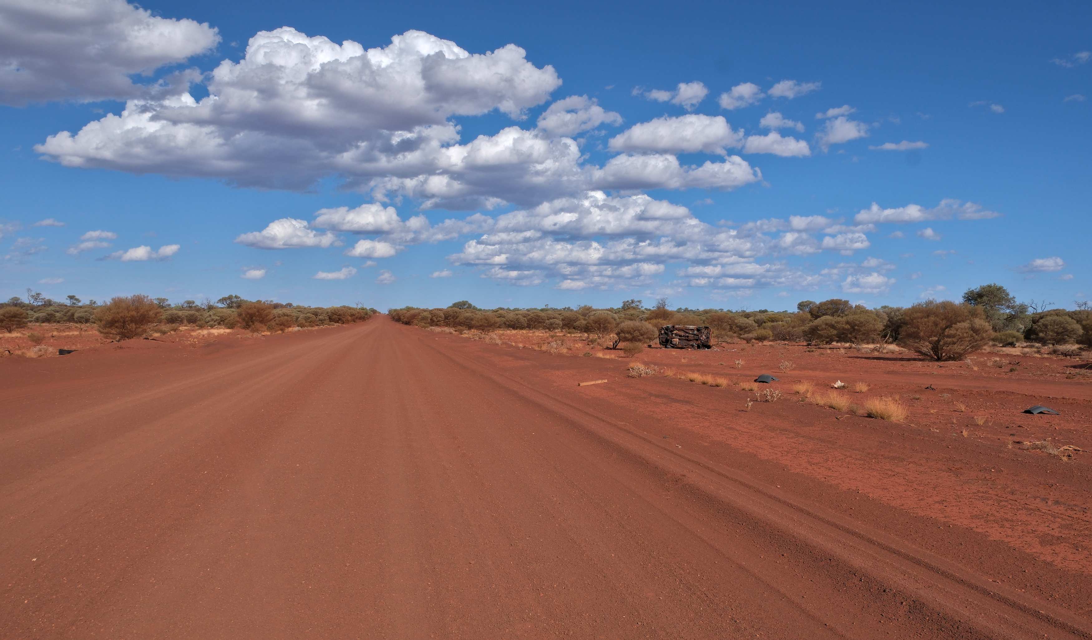 Am nächsten Morgen um 6 Uhr aufgebrochen, weil wieder gut 300 km Gravelroad plus 40 Asphalt vor uns lagen. Nach 19 km einen platten Reifen gewechselt und nach 255 km dem ersten Fahrzeug begegnet. Gut auf den asphaltierten 'Great Northern Highway' gekommen. Aufatmen: Einen weiteren Reifendefekt hätten wir nicht selbst beheben können, wir hatten nur noch einen Ersatzreifen, der nicht auf ein Rad montiert war. Ein Hilferuf wäre sehr teuer geworden.