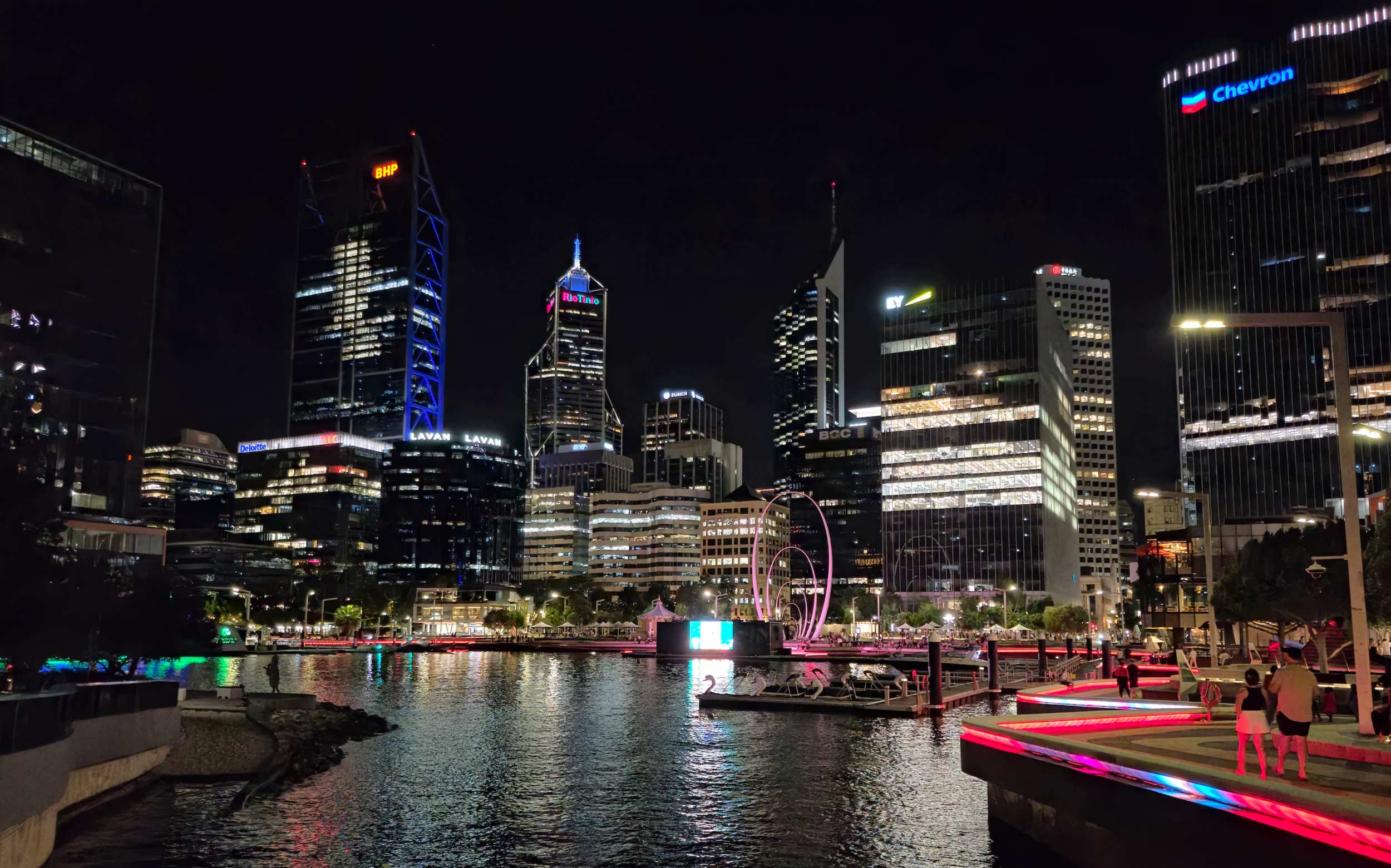 Statt am Mittwochvormittag, konnten wir erst um 17 Uhr mit Bertha von Mercedes aus in den Heiligabend starten, wobei die Windschutzscheibe auf der Straße vor dem inzwischen geschlossenen Werkstattgeländetor, von einer mobilen Autoglaserei gegen 15 Uhr, eingebaut wurde, aber der Kleber noch etwa zwei Stunden trocknen musste. Wir waren dann noch kurz einkaufen und haben bei einem sehr netten Afghanen einen guten Döner, bzw. Falafel, zum Abendmahl verspeist. Übernachtet haben wir am 'Point Belches' auf einem Parkplatz an einer ruhigen Anwohnerstraße mit herrlichem direkten Blick über den Swan River, hier verbreitert zu einem See ('Perth Water'), auf den 'Elisabeth Quai' und die Skyline vom Central Busines District (CBD) von Perth.