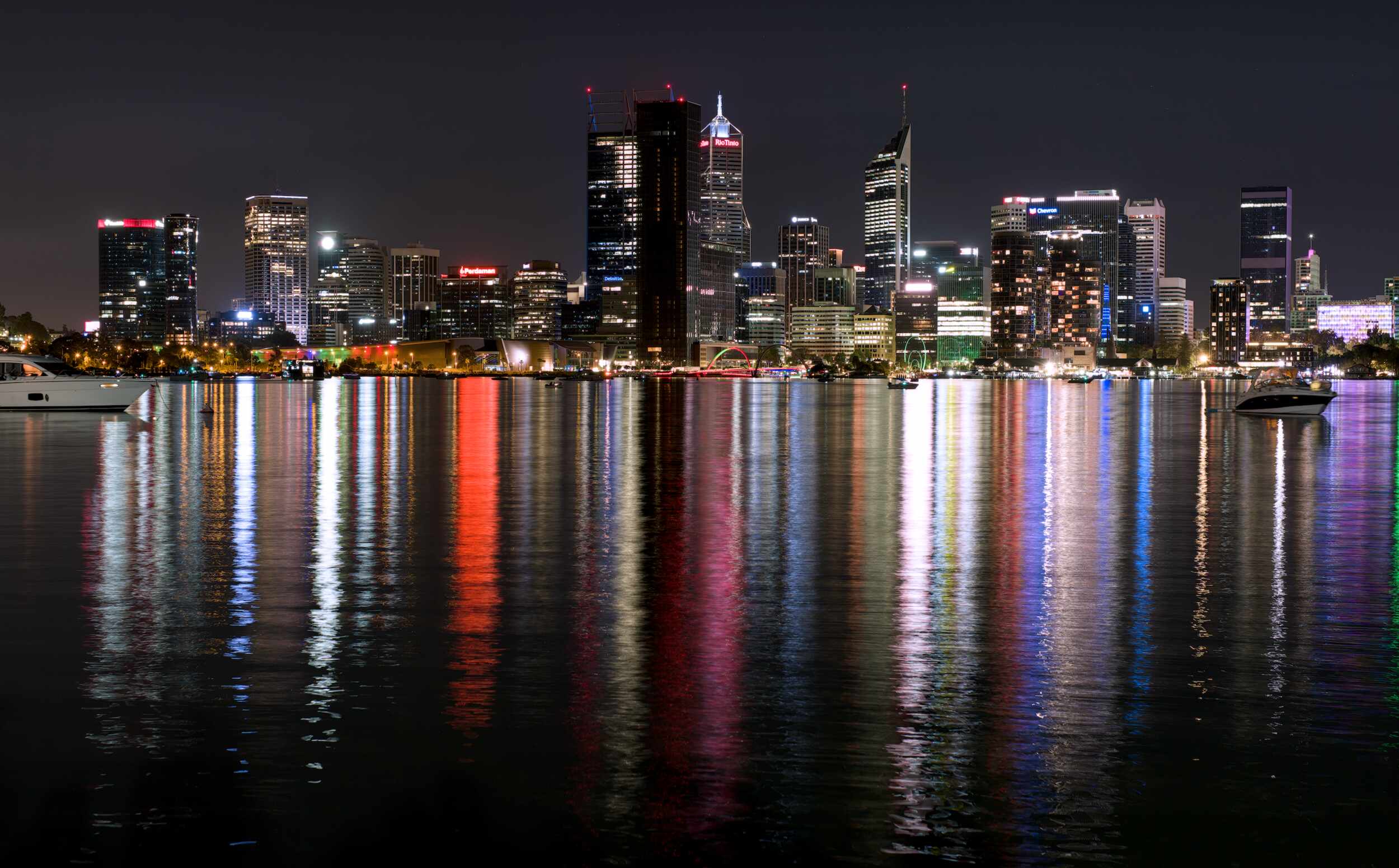 Blick hinüber auf das Zentrum von Perth kurz vor Mitternacht, dann startet das tolle Feuerwerk zum neuen Jahr.