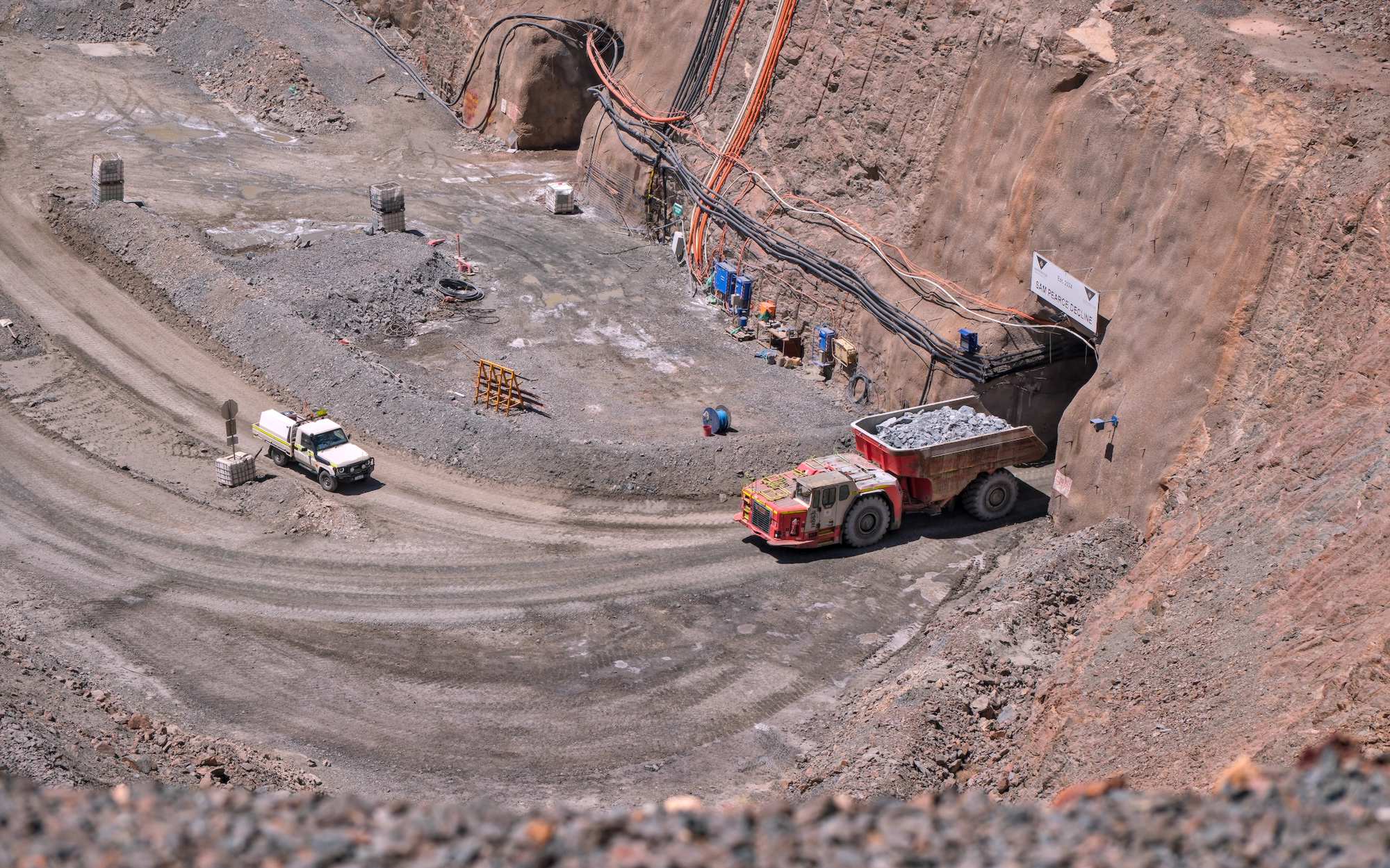 Am nächsten Tag sehen wir die Fahrzeuge im Einsatz bei einer geführten Minentour. Hier der Blick in die 'Super Pit' (riesige Grube) mit zwei Stollenportalen zum Untertageabbau.