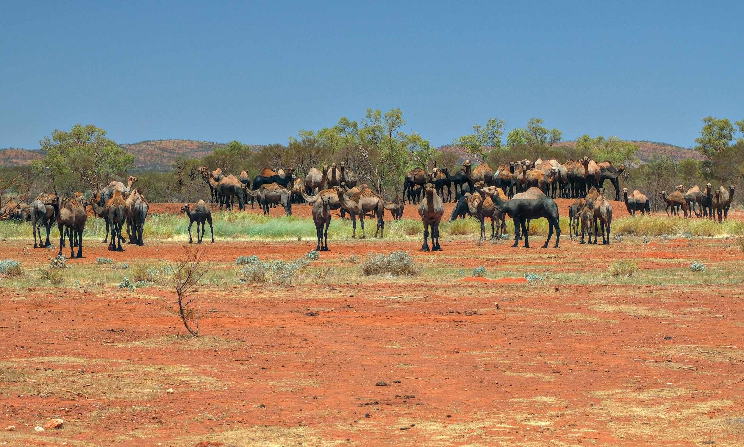 Ein Wasserloch am Ort zieht hunderte wilder Kamele an.