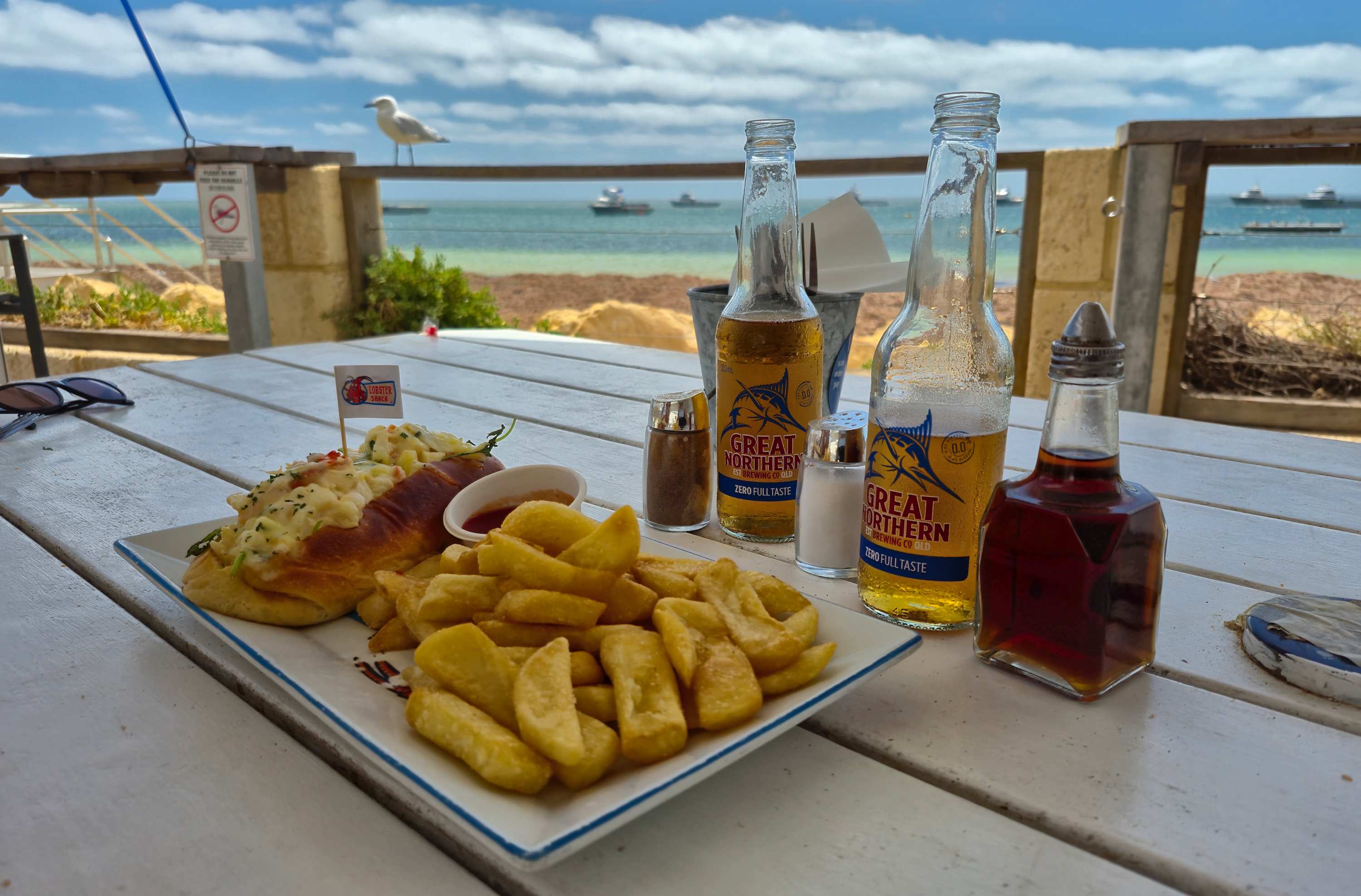 In Cervantes teilen wir uns bei 'Lobster Shack' (Hummerbude) dieses sehr leckere und großzügig mit Lobsterfleisch belegte Brioche mit Pommes und 'Great Northern'. Den Ausblick gibt es gratis dazu.