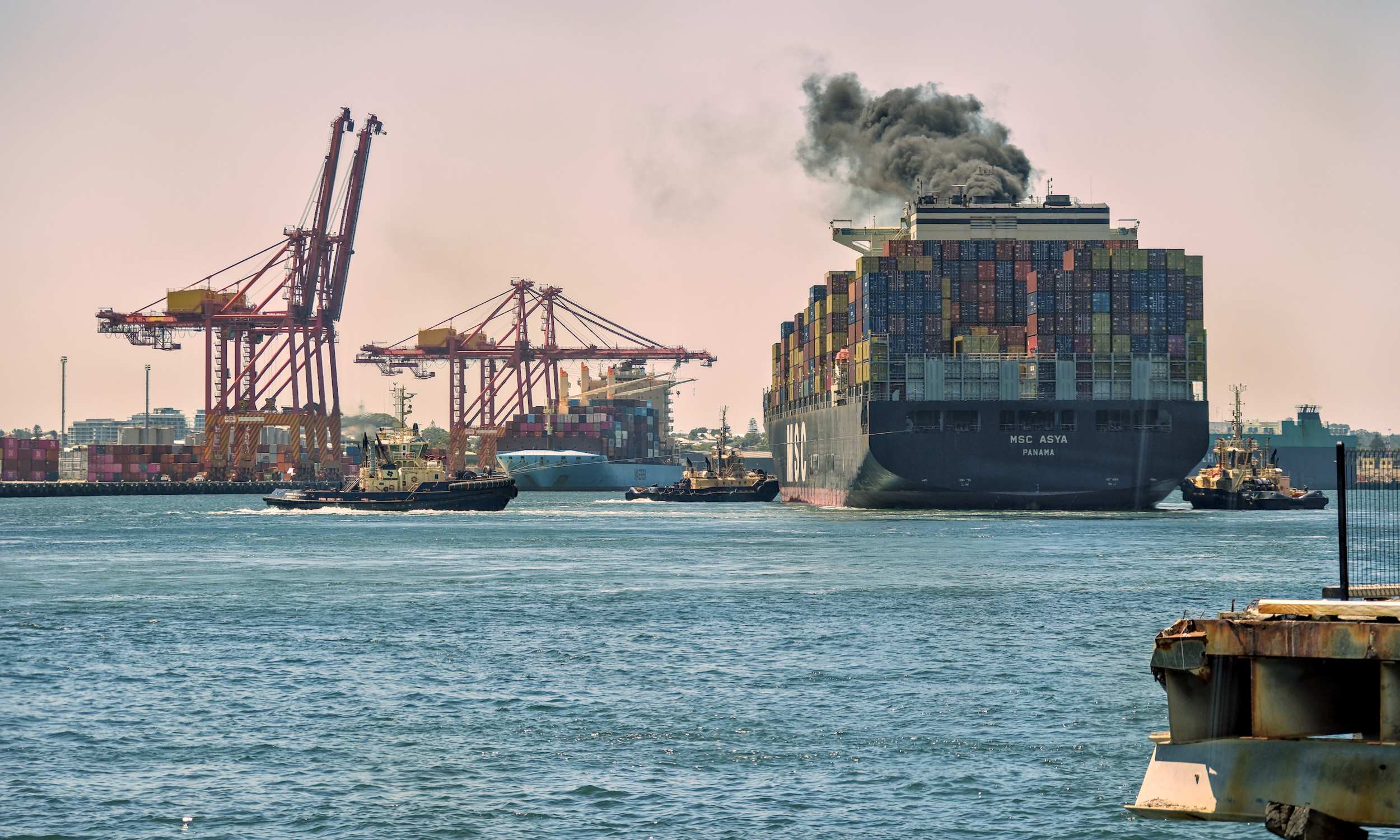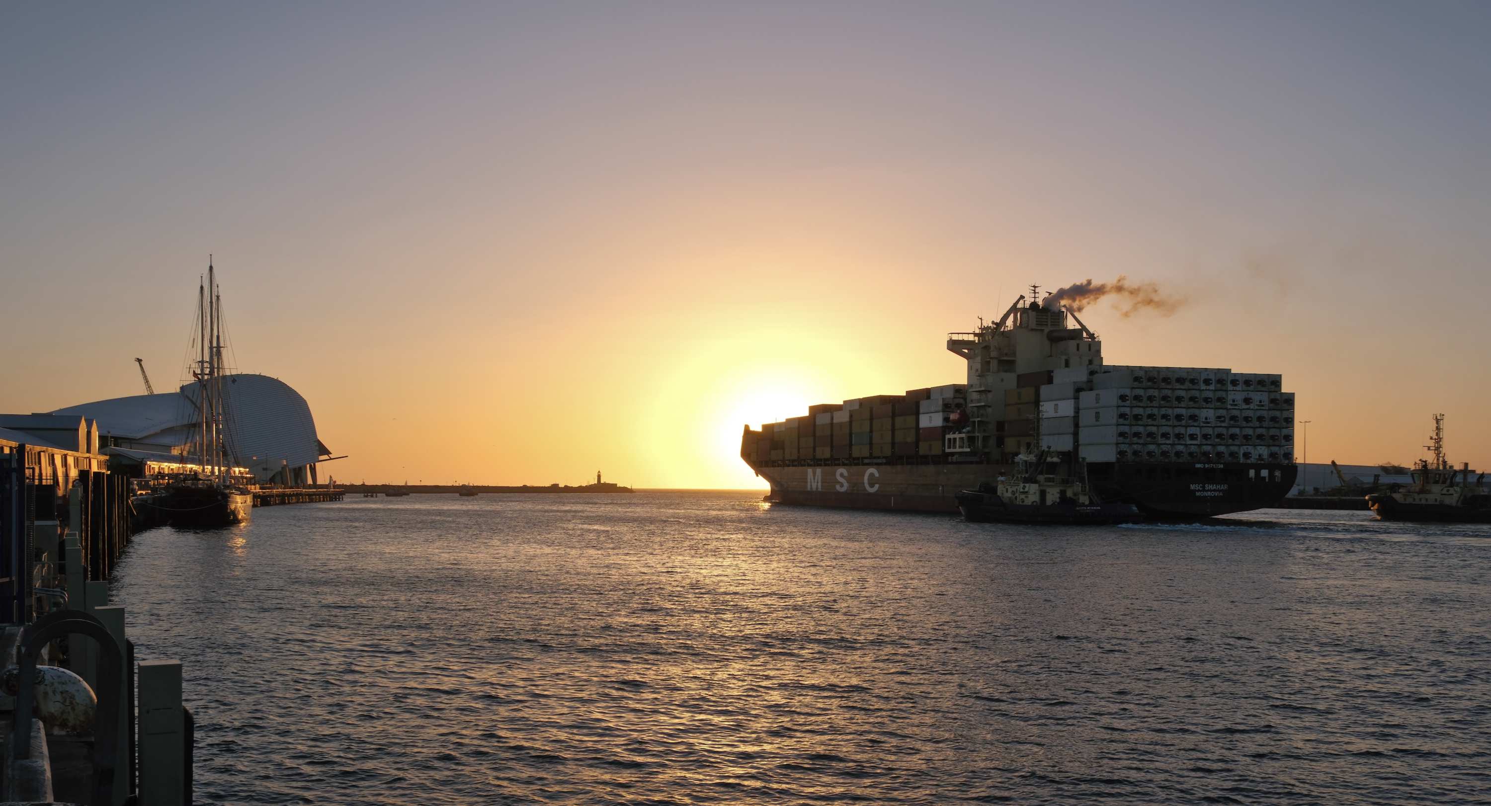 Ein Containerriese der schweizer(!) 'Mediterranean Shipping Company' (MSC), der größten Reederei der Welt, wird an den Verladekai manöveriert.