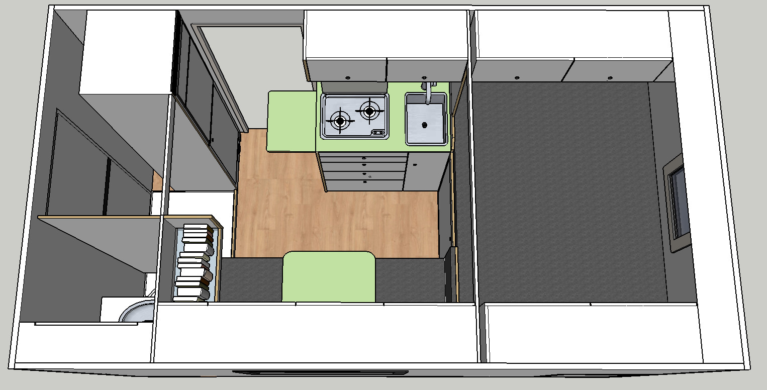 Unser Trinkwasserkanister bekommt einen schmalen Schrank im Küchenblock, in dem auch das kleine Spülbecken eingebaut wird.
