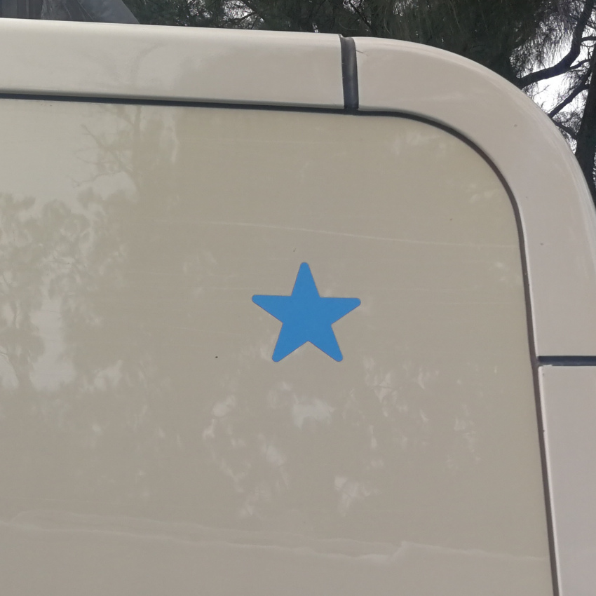 Wir kleben die Adresse unserer Homepage auf die Fahrerhaustüren. Weitere Aufkleber außen und innen siehe Fotos.